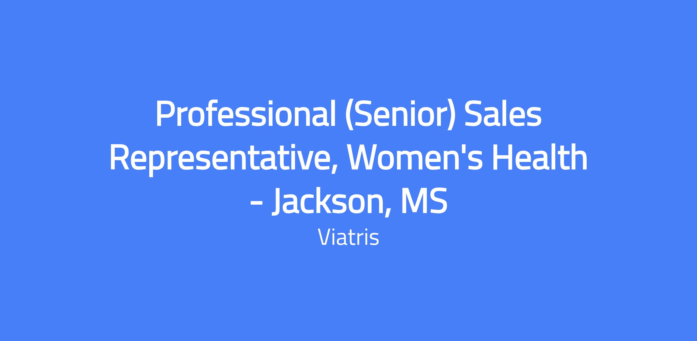 Professional (Senior) Sales Representative, Women's Health in Jackson, MS. Develop the territory business plan, conduct targeted sales presentations, and achieve quarterly sales goals in compliance with ethical practices. Build strong relationships with clinicians and decision-makers, and collect market insights to drive Viatris Women's Health products.