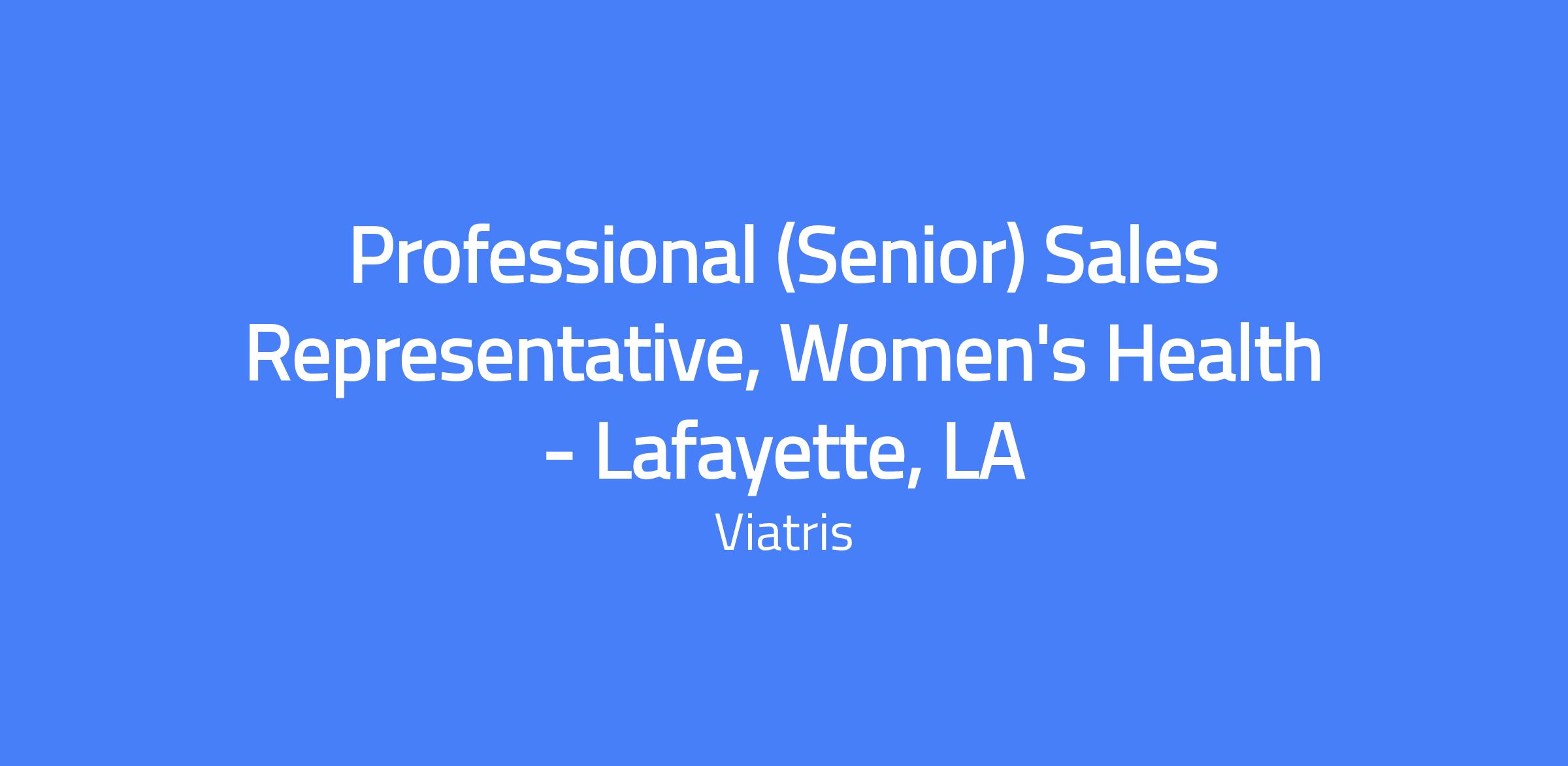 The Professional (Senior) Sales Representative, Women's Health β Lafayette, LA develops territory business plans aligned with Viatris sales strategies, delivers quality sales presentations to targeted customers, and achieves quarterly sales goals while upholding ethical practices and regulatory requirements. This role builds positive relationships with peers, customers and company managers, drives physician awareness of Viatris products, and pursues ongoing professional development in sales, communication, and product knowledge.