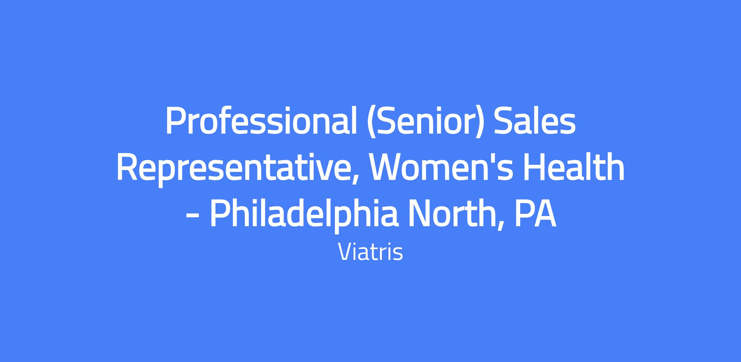 Senior-level sales role responsible for developing and executing the territory business plan for Viatris Women's Health in Philadelphia North, PA. The role involves delivering quality sales presentations to targeted customers, building strong relationships with healthcare professionals and internal stakeholders, and achieving quarterly sales goals in an ethical and compliant manner. Location is Philadelphia North, PA; travel within the territory may be required.