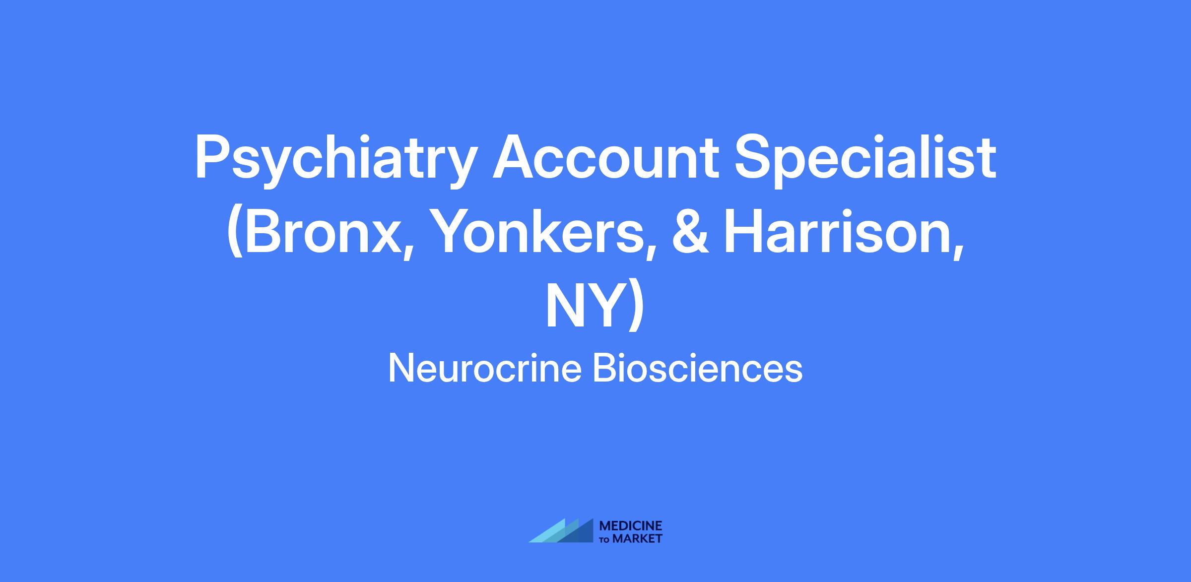Psychiatry Account Specialist for Bronx, Yonkers, & Harrison, NY. Responsible for promoting Neurocrine products within a geographic territory, building long-term relationships with physicians and other customers, and educating external customers about product benefits.
