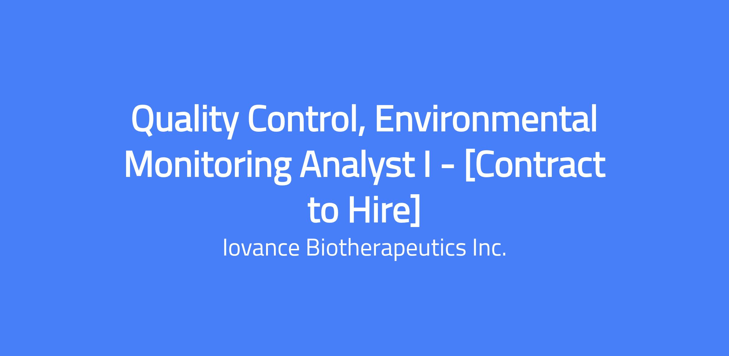 QC Environmental Monitoring Analyst I - will support the QC Environmental Monitoring (EM) operations at Iovance’s Cell Therapy Center (iCTC) and IOVA-A site. The quality environmental monitoring program includes environmental monitoring of production facilities and utility systems, and data analysis. This position works across different shifts. Depending on your assigned shift, you may be required to work overtime, weekends, and holidays to complete assigned work.