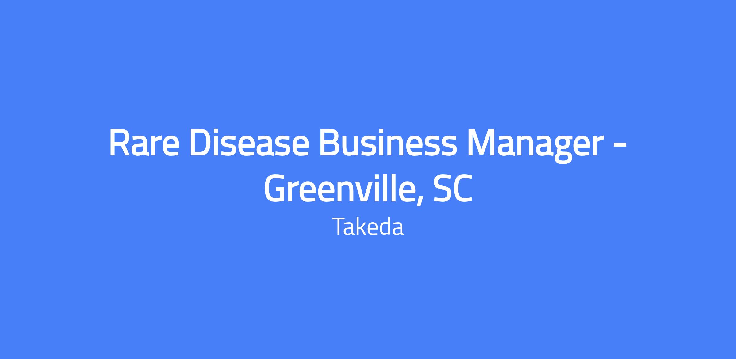 Location: Greenville, SC (virtual within South Carolina). The Rare Disease Business Manager (RDBM) drives sales and territory growth through effective execution of sales strategies and tactics in narcolepsy type 1. This role collaborates with the Regional Business Leader and cross-functional teams to educate healthcare providers and ensure appropriate patients have access to a new therapy once approved. Reporting to the Regional Business Leader, the RDBM will support a new product introduction in a new therapeutic area for Takeda, build relationships with targeted HCPs and accounts, and educate providers on the product, the orexin system, and narcolepsy type 1.