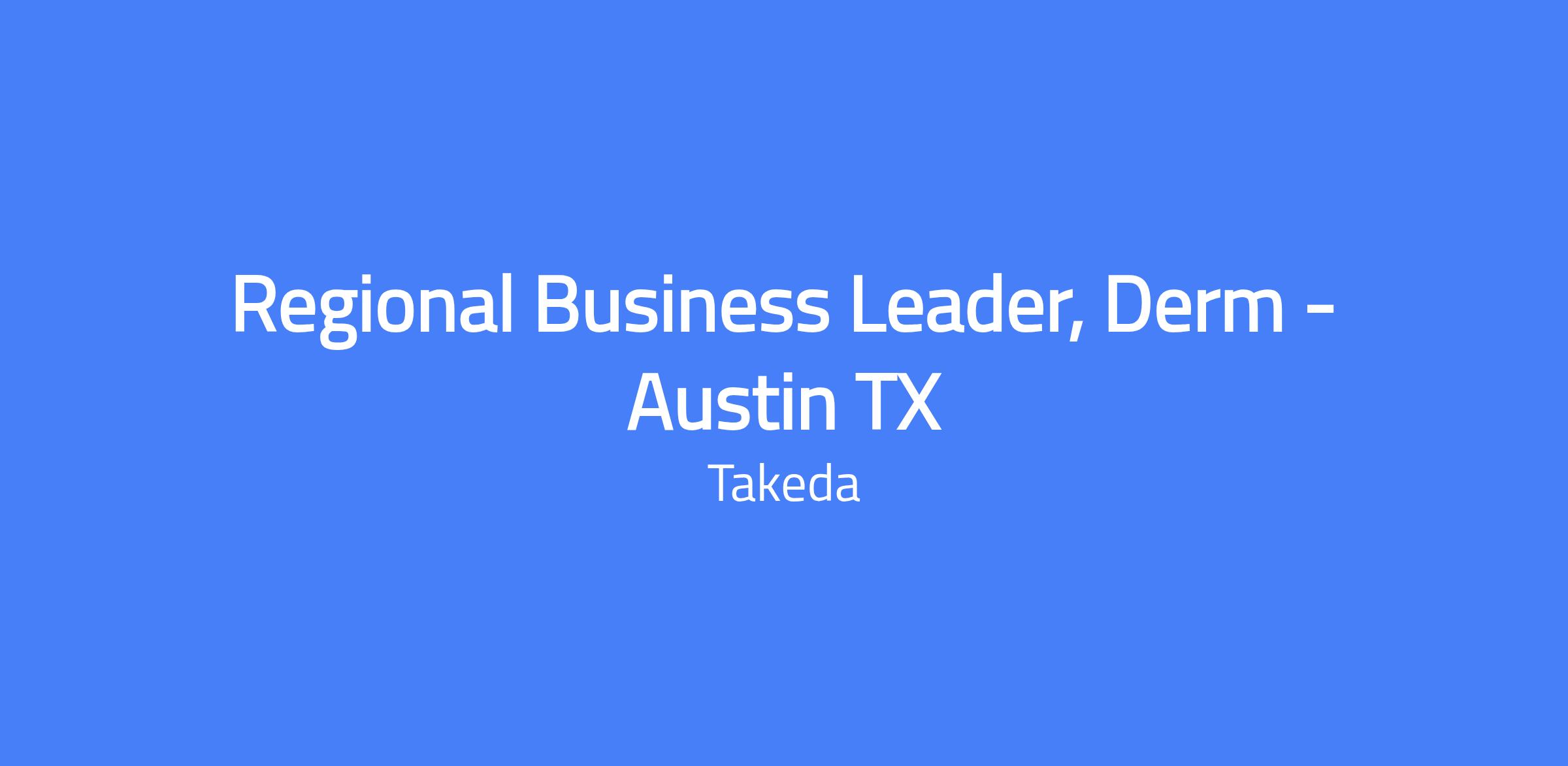 The Regional Business Leader, Dermatology is an enterprise thinker. Through regular in-field interactions, the Regional Business Leader mentors a cross-functional team to identify priorities, deliver clinical value, and provide Takeda resource messaging to Healthcare Providers and Key Accounts, thereby establishing Takeda as a preferred partner. The Regional Business Leader instils a culture of high-performance, accountability and compliant behavior that encourages and motivates their team to complete the brand strategy and tactics. Location: Texas - Virtual.