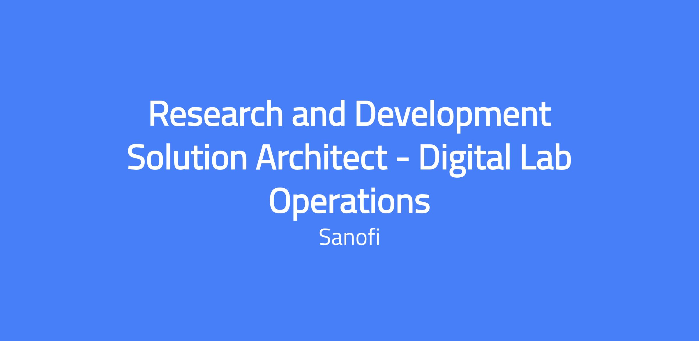 Role: Research and Development Solution Architect - Digital Lab Operations. Location: Morristown, NJ - Cambridge, MA. Lead the design and implementation of solutions for Digital Lab Operations and CMC, ensuring alignment with architecture strategy and governance. Serve as a hands-on leader shaping the Digital Lab Operations and CMC technology strategy across service lines and programs within Sanofi's Architecture CoE.