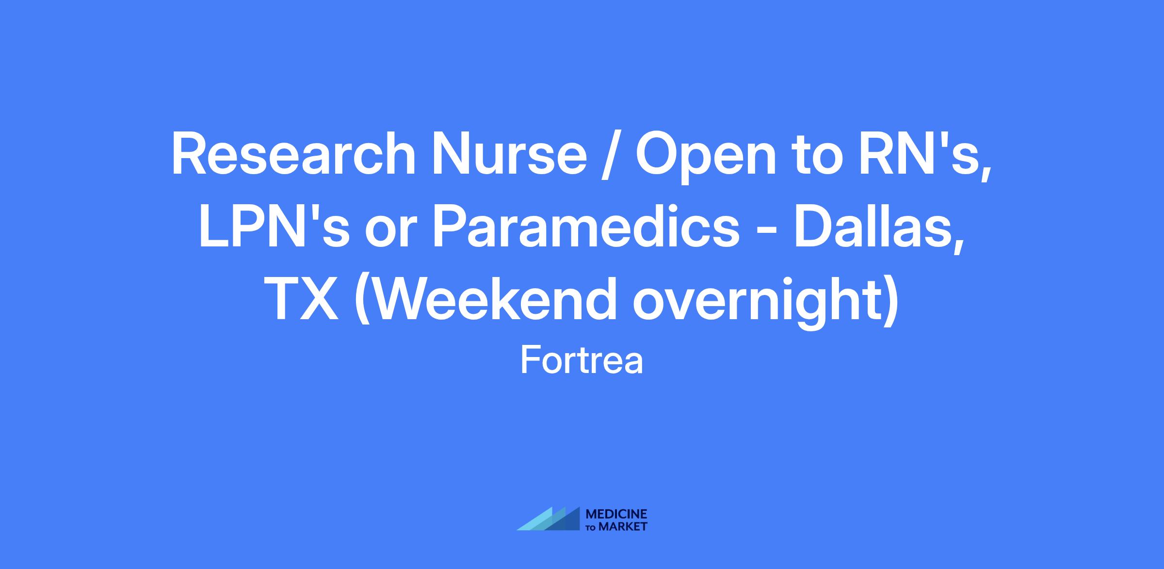 Research Nurse / Open to RN's, LPN's or Paramedics, weekend overnight position in Dallas, TX. Lead and support the Clinical Pharmacology Start-up team in initiating Early Phase clinical trials for clients, focusing on speed and efficiency.
