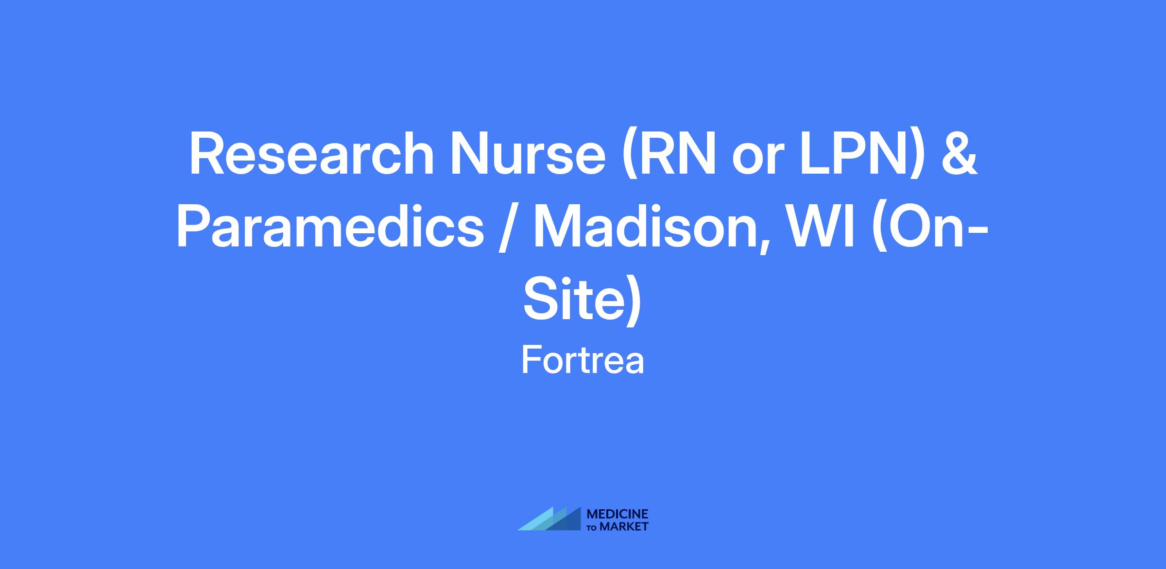 Research Nurse (RN or LPN) & Paramedics, on-site in Madison, WI. Full-time, office/clinic-based role interacting with healthy volunteer participants, reading clinical research protocols, and supporting a fast-paced, team-oriented environment across various therapeutic indications and study types in Phase 1 trials.