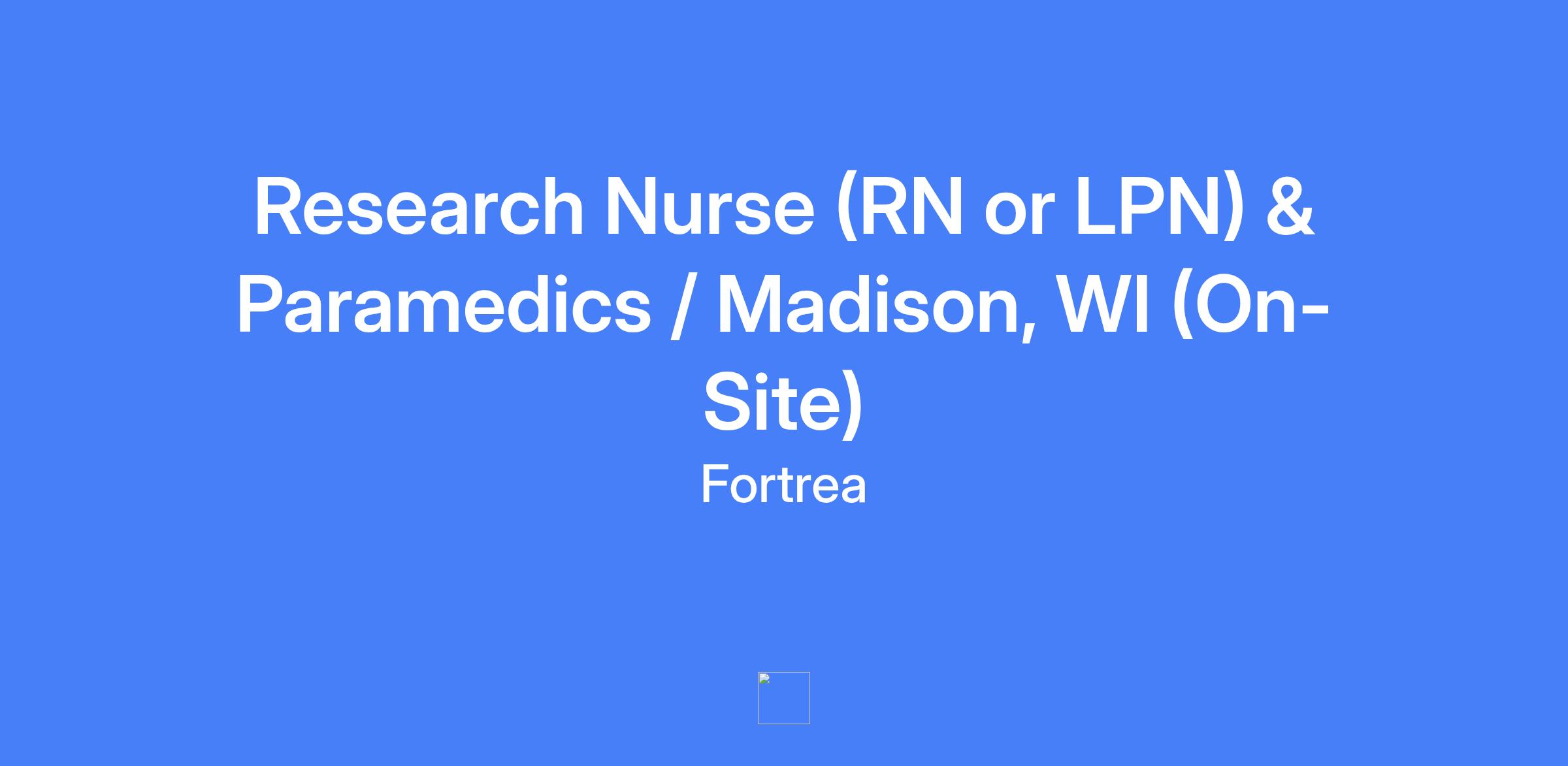 Research Nurse (RN or LPN) & Paramedics, on-site in Madison, WI. Full-time, office/clinic-based role interacting with healthy volunteer participants, reading clinical research protocols, and supporting a fast-paced, team-oriented environment across various therapeutic indications and study types in Phase 1 trials.