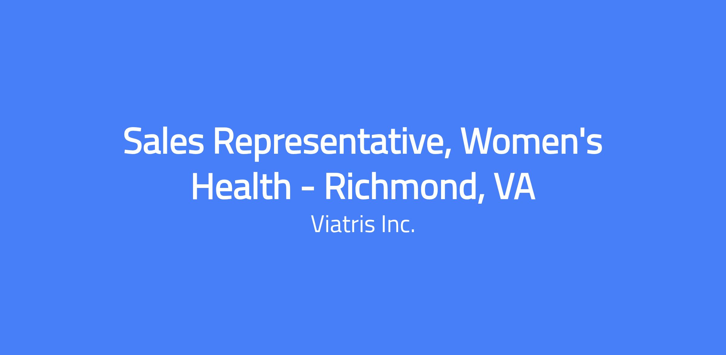 Viatris Specialty LLC Viatris is a global healthcare company uniquely positioned to bridge the traditional divide between generics and brands, combining the best of both to more holistically address healthcare needs globally. With a mission to empower people worldwide to live healthier at every stage of life, we provide access at scale, currently supplying high-quality medicines to approximately 1 billion patients around the world annually and touching all of life's moments, from birth to the end of life, acute conditions to chronic diseases. We have been included on number of award lists that demonstrate the impact we are making. Every day, we rise to the challenge to make a difference and here’s how the Sales Representative, Women's Health - Richmond, VA role will make an impact: Key responsibilities for this role include: Develop business plan for assigned territory that is consistent with Viatris sales plans, strategies and objectives. Conduct quality sales presentations to all targeted customers. Achieve quarterly sales goals within territory while adhering to all ethical sales practices and required regulations. Understand and demonstrate targeting principles. Develop pre-call planning strategy for key targets. Develop positive and interactive relationships with peers, customers, and Company managers. Responsible for ensuring high levels of call and field productivity. Gather and utilize information from offices, pharmacists and others to develop and implement specific strategies for territory prescribers. Leverage sample program, literature and other items to ensure physician awareness of Viatris products. Responds appropriately to all customer requests in a timely, reliable manner with information that is consistent with the request. Actively pursue continuous learning and professional development on efficient sales, communication & product knowledge training. Perform other duties as assigned. The minimum qualifications for this role are: Minimum of a Bachelor’s degree and 0-3 years of B2B sales experience. However, a combination of experience and/or education will be taken into consideration. Demonstrated business acumen. Demonstrated success in influence and negotiation skills. Excellent oral and written communication skills. Strong verbal, interpersonal and listening skills. Demonstrated ability to work independently and as a team member to deliver results. Demonstrated self-starter and highly motivated. Ability to travel throughout territory (may include overnight travel). Must reside in territory geography. Must possess a valid Driver's License and an acceptable driving record. Authorization and ability to drive a Company leased vehicle or authorized rental vehicle. Professional or Senior leveling will be based on years of relevant pharmaceutical sales experience. Proficiency in speaking, comprehending, reading and writing English is required. Exact compensation may vary based on skills, experience, and location. The salary range for this position is $72,000.00 - $108,000.00 USD. At Viatris, we offer competitive salaries, benefits and an inclusive environment where you can use your experiences, perspectives and skills to help make an impact on the lives of others. Viatris is an Equal Opportunity Employer. All qualified applicants will receive consideration for employment without regard to race, national origin, religion, age, color, sex, sexual orientation, gender identity, gender expression, disability, or protected veteran status, or any other characteristic protected by local, state, or federal laws, rules, or regulations. #LI-Remote Viatris is a global healthcare company formed in 2020 through the combination of Mylan and Upjohn, a legacy division of Pfizer. By integrating the strengths of these two companies, including our global workforce, we aim to deliver increased access to affordable, quality medicines for patients worldwide, regardless of geography or circumstance. We believe in healthcare as it should be – empowering people worldwide to live healthier at every stage of life. Because of our unwavering belief that better access leads to better health, we leverage our best-in-class manufacturing and scientific expertise and proven commercial capabilities to bring quality medicines to patients when and where they need them.