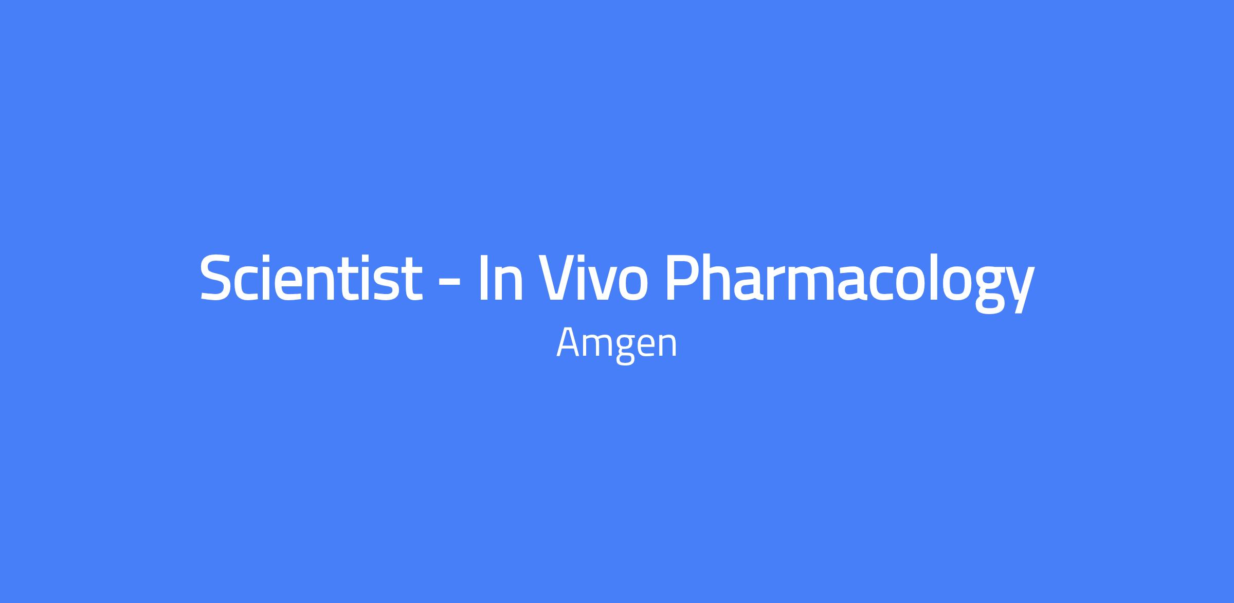 Scientist - In Vivo Pharmacology. Based in Thousand Oaks, CA, you will generate and communicate pharmacology data to support the progression of oncology and immunotherapy research programs. You will design, conduct, analyze, and report in vivo and in vitro studies; perform rodent dosing and clinical health assessments; execute cellular assays to help interpret in vivo observations; and ensure compliance with SOPs, business practices, and company policies. You will participate in cross-departmental teams to advance programs and communicate findings clearly.