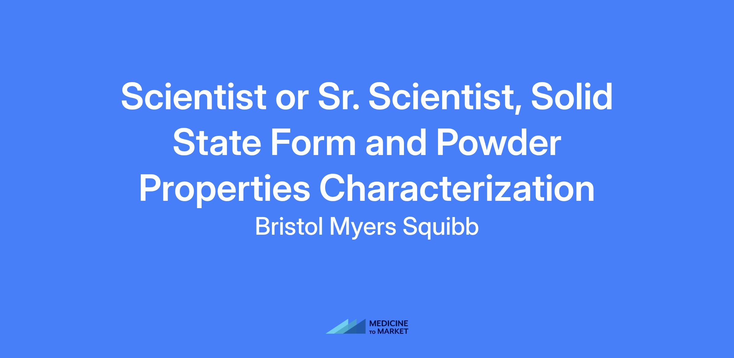 Scientist or Senior Scientist, Solid State Form and Powder Properties Characterization. Responsible for solid state form and powder properties characterization to guide robust drug substance and drug product development across all stages. Work with a broad range of materials, including crystalline and non-crystalline small molecule APIs, drug product intermediates and excipients, and biologics. Build powder property knowledge, identify critical quality attributes, and propose powder property control strategies. Collaborate within cross-functional teams and maintain a safe laboratory environment.