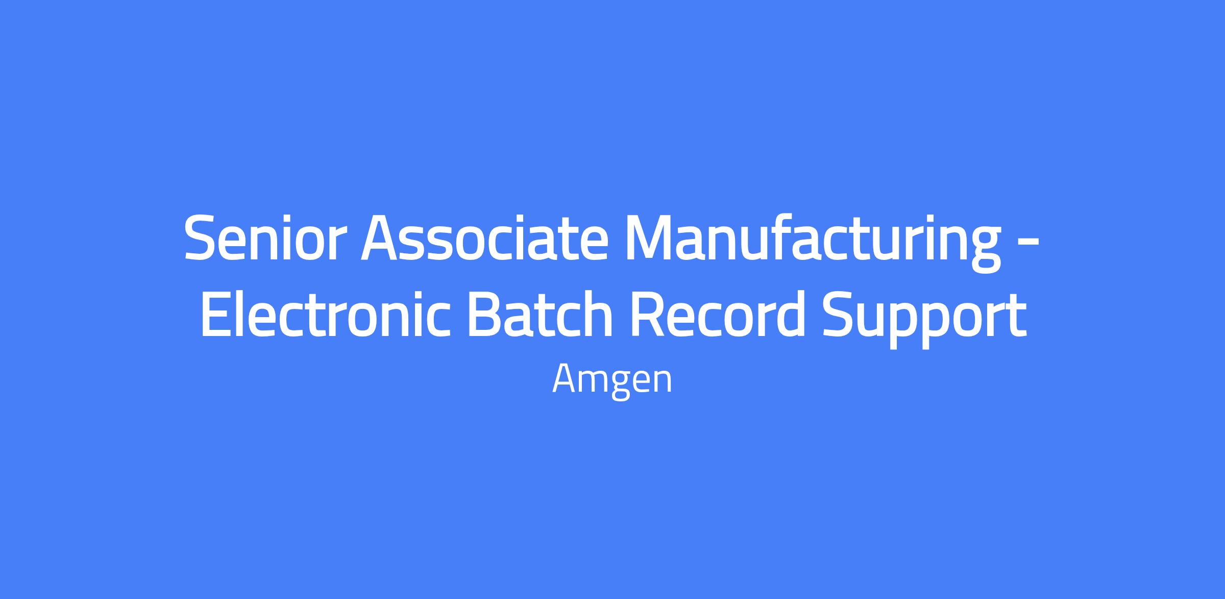 Senior Associate Manufacturing - Electronic Batch Record Support. Support the start-up of the Amgen North Carolina manufacturing facility by generating electronic documentation, tracking EBR metrics, and coordinating communication between operations teams and functional groups during start-up activities. Oversight of electronic batch records readiness across multiple manufacturing areas and involvement in SOP creation, job aids, digital tools development, and staff training.