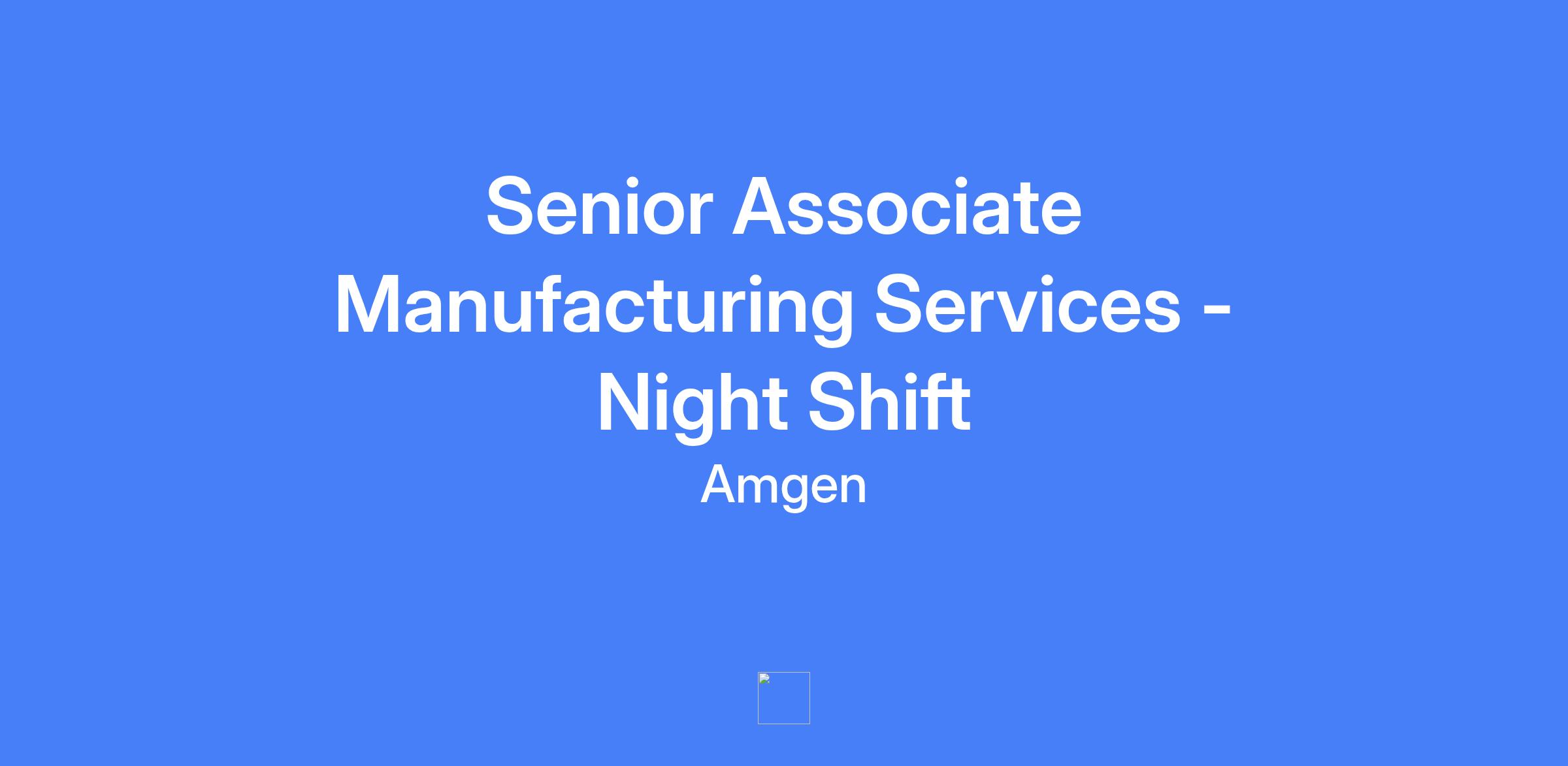 Senior Associate Manufacturing Services (Night Shift) responsible for on-the-floor manufacturing operations of cGMP drug substance at Amgen North Carolina, following cGMP practices on a rotating 12-hour shift.