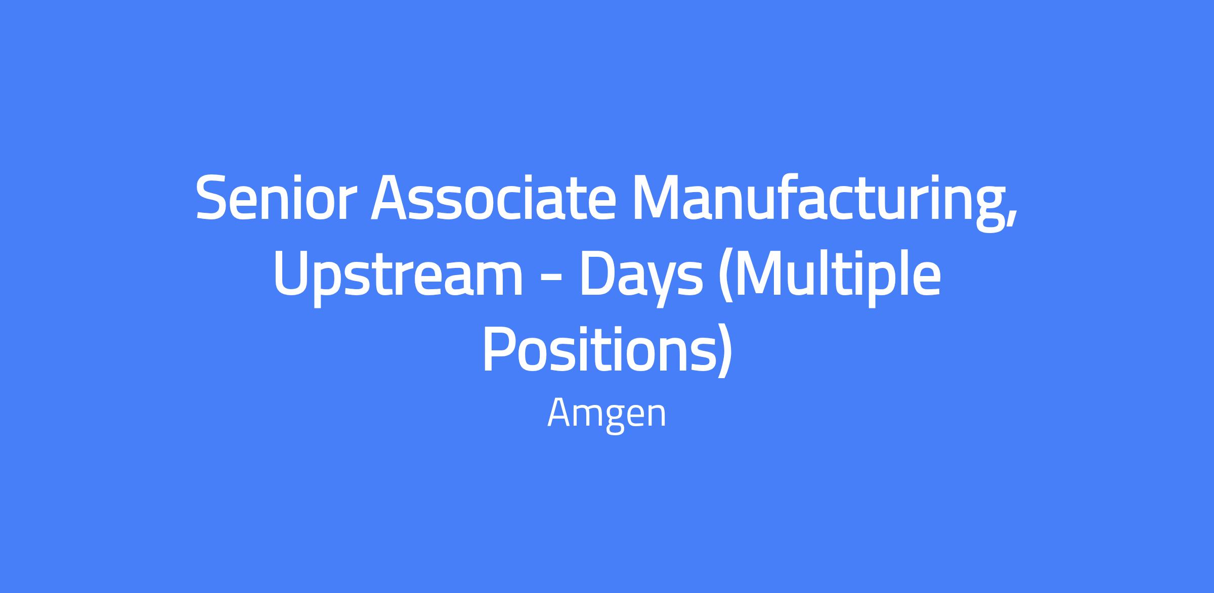 Senior Associate, Upstream (Days) supports Amgen's 24/7 upstream manufacturing operations at Amgen North Carolina. This on-the-floor role executes cGMP drug substance manufacturing in the upstream area on a 12-hour 2-2-3 schedule (5:45 am–6:15 pm). The position requires hands-on operation, on-the-floor execution of process steps, documentation, and cross-functional collaboration to ensure safe, compliant production of drug substances.