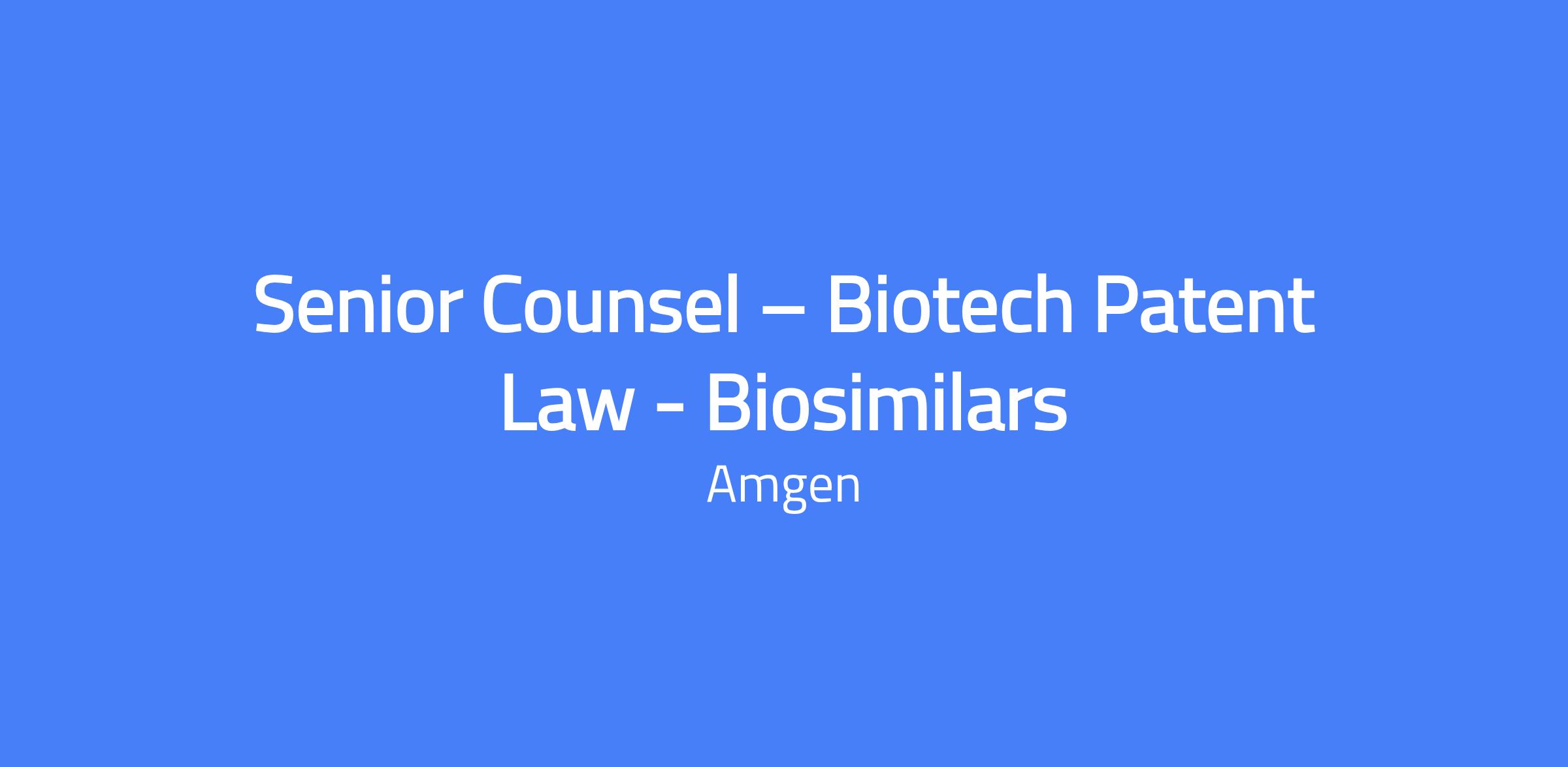 Senior Counsel – Biotech Patent Law - Biosimilars. Develop, implement and execute a market access strategy for Amgen’s biosimilar and/or innovator molecules, including freedom-to-operate analyses for drug substance, drug product, formulations, processes, and methods of treatment.