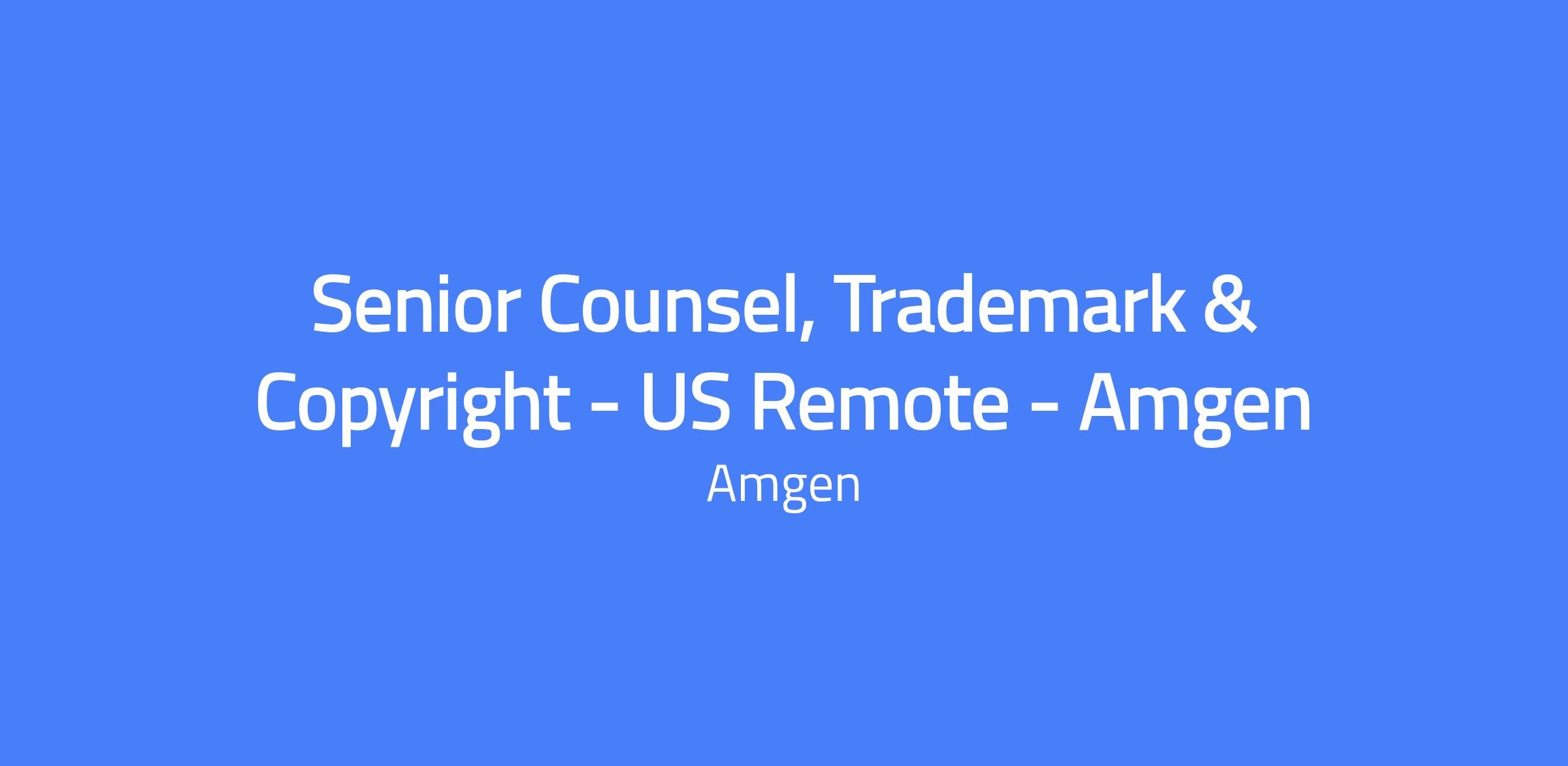 Senior Counsel, Trademark & Copyright. Responsible for the day-to-day execution and management of Amgen's global trademark strategy and portfolio for therapeutic products and product candidates, copyright, domain names, and social media handles. Provides guidance on AI-generated content and advises cross-functional teams across geographies. This role can be remote or based in Thousand Oaks, CA; Cambridge, MA; or South San Francisco, CA.