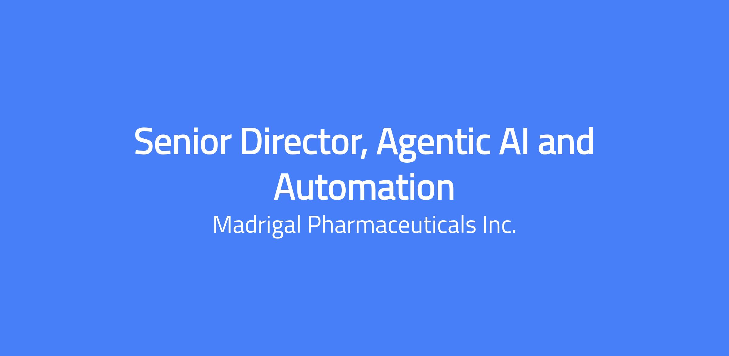 Madrigal is a biopharmaceutical company focused on delivering novel therapeutics for metabolic dysfunction-associated steatohepatitis (MASH), a liver disease with high unmet medical need. Madrigal’s medication, Rezdiffra (resmetirom), is a once-daily, oral, liver-directed THR-β agonist designed to target key underlying causes of MASH. Rezdiffra is the first and only medication approved by both the FDA and European Commission for the treatment of MASH with moderate to advanced fibrosis (F2 to F3). An ongoing Phase 3 outcomes trial is evaluating Rezdiffra for the treatment of compensated MASH cirrhosis (F4c). Job Title: Senior Director, Agentic AI & Automation Department: IT Manager: Executive Director, AI and Data Science Job Profile Summary Madrigal Pharmaceuticals is seeking an innovative, systems‑thinking leader to set the vision, design, and enterprise‑wide deployment of agentic workflows—AI‑enabled, plan–act–reflect automations that learn over time and augment human decision‑making. You will orchestrate autonomous or semi‑autonomous digital agents across R&D, Commercial, Medical Affairs, and Corporate functions, accelerating operational efficiency and unlocking the full potential of generative and agentic AI within a regulated biotech environment. Role & Responsibility Define and execute a multi‑year agentic AI & RPA roadmap converging hyperautomation, process‑mining, and LLM‑driven workflows. Operationalize an Agentic Automation Center of Excellence (CoE) governing standards, reusable assets, and ROI tracking. Partner with cross‑functional executives to prioritise high‑value automations across the business. Responsibility Statements Strategic Leadership & Hyperautomation Vision Define and execute a multi‑year roadmap converging agentic AI, RPA, and process‑mining. Operationalize an Agentic Automation CoE—governing standards, reusable templates, and ROI tracking. Partner with executive stakeholders to prioritise high‑value automations (clinical, commercial, PV, manufacturing). Champion MCP and agent‑orchestration patterns for future‑proof integration. Technology & Architecture Architect modular multi‑agent systems powered by frontier LLMs and leading agent frameworks (LangChain family, AutoGen, CrewAI, etc.). Design secure agent‑to‑agent (A2A) communication with shared memory, credential vaults, RBAC. Implement enterprise MCP engine and Agent Protocol standards enabling human–agent–bot collaboration. Standardise integration with vector stores and cloud MLOps platforms (Azure AI Search, Databricks, SageMaker, Vertex AI). Automation, Integration & Governance Build event‑driven, low‑code pipelines (n8n, Dify, Glean) to trigger agentic RPA tasks in real time. Implement observability and governance (Arcade.dev, AgentOps, Langfuse). Establish robust testing harnesses and GxP‑compliant validation for every autonomous workflow. Leverage process‑ & task‑mining insights to auto‑generate automation backlogs and measure value. Intelligent Process Discovery & Product Execution Lead a multi‑disciplinary squad of AI automation architects, prompt engineers, and product managers. Drive iterative product delivery using agile OKRs, rapid POCs, and continual KPI evaluation. Innovation & Partnerships Experiment with cutting‑edge agent research (ReWOO, SuperAGI, CAMEL) and open‑source Agentic RPA. Collaborate with open‑source communities, cloud partners, and leading vendors. Set standards for agent safety, ethical AI, and closed‑loop feedback. Forge deep partnerships with Enterprise Data, IT Infrastructure, and Cybersecurity teams. Qualifications Advanced degree (Ph.D. preferred) in AI, Data Science, Computer Science, Applied Mathematics, Engineering, Physics, or related field. 15+ years leading AI/ML or intelligent‑automation initiatives; 10+ years hands‑on with Python, SQL, R, MATLAB, PyTorch, Keras, Git. 12+ years architecting ML/deep‑learning solutions incl. LLMs (GPT‑4, BERT, LLaMA, Dolly) and RAG pipelines. 8+ years building web apps (Dash, Streamlit, Shiny) and advanced data products. 8+ years implementing scalable AI/ML on platforms like Databricks or Dataiku, with strong AI/MLOps. Deep knowledge of cloud data platforms (AWS, Azure, GCP) and compliance (GxP, HIPAA, GDPR). Strong theoretical foundation in ML/AI with contributions to papers and presentations. Exceptional written & verbal communication skills translating complex research to executives. Leadership/Autonomy Leads multi‑disciplinary squads and influences enterprise‑wide AI & automation strategy. Operates with significant autonomy to set technical direction and allocate resources. Problem Solving Applies deep expertise in ML, generative AI, and systems engineering to solve complex, cross‑domain challenges. Leverages quantitative skills to inform data‑driven decisions and optimize agentic workflows. Impact Accelerates operational efficiency, compliance, and patient outcomes by embedding intelligent automation across critical functions. Establishes Madrigal as a leader in safe, regulated agentic AI deployment. Typical Degree & Years of Experience Ph.D. in a quantitative field plus 15+ years in AI/ML and intelligent automation. Extensive leadership experience managing cross‑functional technology teams in regulated industries. Madrigal’s Total Rewards strategy is based on a biotech industry peer group comparator and is inclusive of base pay, bonus and equity. Our equity offers meaningful opportunity allowing our employees to share in the success they help create. By aligning individual and company performance, we empower employees to think like owners, giving them a stake in the organization. All employees receive equity, which we believe reinforces our ownership culture. Base salary is determined by several factors including the candidate’s qualifications, skills, education, experience, business needs and market demands. The base salary range for 