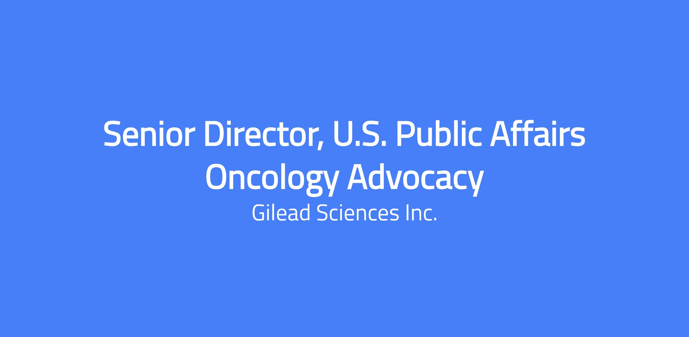 At Gilead, weâre creating a healthier world for all people. For more than 35 years, weâve tackled diseases such as HIV, viral hepatitis, COVID-19 and cancer â working relentlessly to develop therapies that help improve lives and to ensure access to these therapies across the globe. We continue to fight against the worldâs biggest health challenges, and our mission requires collaboration, determination and a relentless drive to make a difference. Every member of Gileadâs team plays a critical role in the discovery and development of life-changing scientific innovations. Our employees are our greatest asset as we work to achieve our bold ambitions, and weâre looking for the next wave of passionate and ambitious people ready to make a direct impact. We believe every employee deserves a great leader. People Leaders are the cornerstone to the employee experience at Gilead and Kite. As a people leader now or in the future, you are the key driver in evolving our culture and creating an environment where every employee feels included, developed and empowered to fulfil their aspirations. Join Gilead and help create possible, together. Job Description At Gilead our pursuit of a healthier world for all people has yielded a cure for hepatitis C, revolutionary improvements in HIV treatment and prevention as well as advancements in therapies for viral and inflammatory diseases and certain cancers. We set and achieve bold ambitions in our fight against the worldâs most devastating diseases, united in our commitment to confronting the largest public health challenges of our day and improving the lives of patients for generations to come. Role Overview Reporting to the Executive Director, U.S. Public Affairs Oncology Team Lead, this Senior Director will lead U.S. advocacy strategy across Gileadâs Oncology portfolio, with a primary focus on a late-stage asset. The role shapes and advances Gileadâs position as an emerging oncology leader by elevating the patientâs voice, articulating a compelling oncology vision, and partnering externally to address unmet needs. This leader will work closely with U.S. Commercial, Medical Affairs, and Government Affairs teams, as well as Global Public Affairs Centers of Excellence, to drive an integrated, One PA approach that supports development milestones, launches, and long-term reputation building. Key Responsibilities Advocacy & Strategic Leadership Own and drive the U.S. advocacy strategy for a late-stage oncology asset, aligned with commercial planning, clinical milestones, global oncology strategy, medical priorities, and enterprise objectives. Set vision, priorities, and engagement strategies with advocacy partners, serving as a senior counselor on patient needs, policy dynamics, and emerging risks and opportunities. Develop and maintain a cohesive patient narrative, including core messaging, data storylines, and storytelling tools used across functions and markets. Advise and partner with senior leaders across Commercial, Medical Affairs, and Government Affairs to advance Gileadâs oncology leadership, including current efforts in TNMBC. Cross Functional Engagement Represent U.S. Oncology Public Affairs on cross functional teams to ensure integrated communications across clinical, commercial, medical, regulatory, access, and affiliate partners. Support U.S. product launches and key clinical/regulatory milestones through coordinated advocacy and communications strategies. Drive global to local alignment across Gilead Oncology and Kite Public Affairs, ensuring timely guidance, materials, and strategic consistency. Design and implement advocacy partnerships and programs that raise awareness, mobilize patients, and elevate public understanding of unmet needs in TNMBC and oncology. Serve as the primary relationship lead for key advocacy organizations, strengthening Gilead Oncologyâs reputation and leadership position. Team, Agency & Budget Leadership Lead, mentor, and develop internal team members supporting oncology advocacy efforts. Oversee agency partners and sponsorships, ensuring compliant execution aligned with Gilead business conduct policies. Manage advocacies, partnerships, and funding processes, optimizing resources for strategic impact and measurable outcomes. Drive operational excellence through disciplined planning, resource allocation, and performance measurement. Knowledge, Experience & Skills Required Bachelorâs degree with 14+ years of relevant experience in biotechnology, pharmaceuticals, healthcare, advocacy, or scientific communications; or master's degree with 12+ years of experience. Proven experience leading product related advocacy strategies tied to clinical data, regulatory milestones, and launch preparation. Demonstrated ability to influence senior leaders, academic experts, and patient advocates with credibility and confidence. Strong written, verbal, and interpersonal communication skills, with the ability to drive alignment across complex, matrixed organizations. Prior experience in oncology, advocacy, government affairs, policy, or medical affairs. Preferred Experience working outside the U.S. or in global roles. Passion for oncology and public health. Experience with digital communications, consumer marketing, analytics, and impact measurement. Knowledge of regulations governing advocacy engagements and sponsorships in publicly traded biopharmaceutical companies. Leadership Accountabilities Strategy First: Align advocacy efforts with U.S. business, enterprise strategy and evolving external landscape. Matrix Leadership: Lead inclusively across diverse teams and functions, embedding collaboration and shared value. Team Empowerment: Connect teams to purpose and organizational goals, removing barriers and enabling success. Thoughtful Prioritization: Integrate U.S., global and corporate perspectives while balancing cross functional demands. Inclusive Leadership: Champion diverse perspectives to ensure the patient voice is consiste