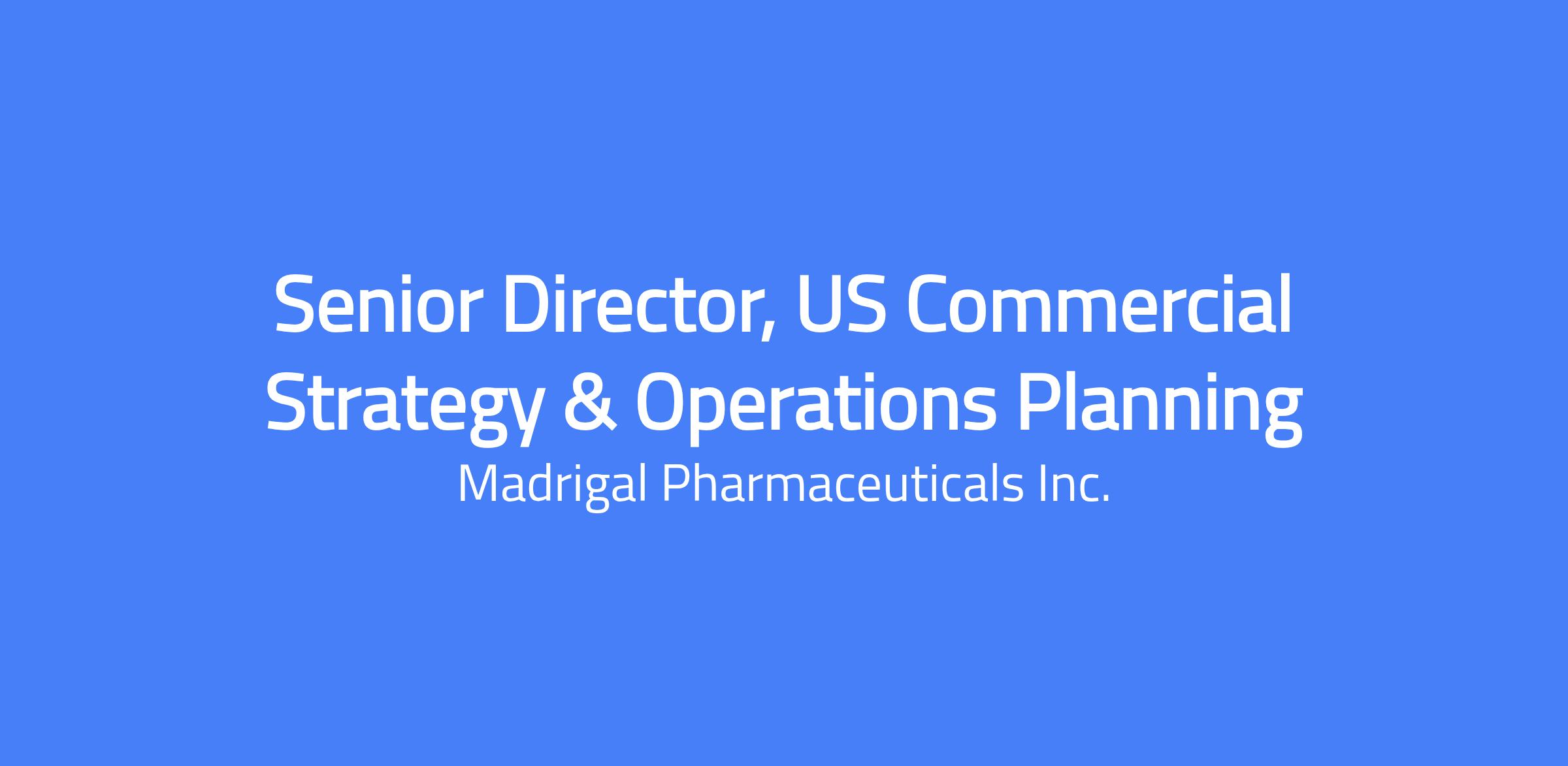 Madrigal is a biopharmaceutical company focused on delivering novel therapeutics for metabolic dysfunction-associated steatohepatitis (MASH), a serious liver disease that can progress to cirrhosis, liver failure, need for liver transplantation and premature mortality. Every member of our Madrigal team is connected by our shared purpose: leading the fight against MASH. Madrigal’s medication, Rezdiffra (resmetirom), is a once-daily, oral, liver-directed THR-β agonist designed to target key underlying causes of MASH. Rezdiffra is the first and only medication approved by both the FDA and European Commission for the treatment of MASH with moderate to advanced fibrosis (F2 to F3). An ongoing Phase 3 outcomes trial is evaluating Rezdiffra for the treatment of compensated MASH cirrhosis (F4c). Our success is driven by our people. We are building a dynamic, inclusive, and high-performing culture that values scientific excellence, operational rigor, and collaboration. To support our continued growth, we are strengthening our workforce strategy to ensure we have the right talent, at the right time, in the right way. Senior Director, US Commercial Strategy and Operations Planning Conshohocken, PA About Us Madrigal is a biopharmaceutical company focused on developing novel therapeutics for non-alcoholic steatohepatitis (NASH), also known as metabolic dysfunction-associated steatohepatitis (MASH). Our first therapy, Rezdiffra (resmetirom), has received accelerated approval from the U.S. Food and Drug Administration (FDA) for treating adults with NASH and moderate to advanced liver fibrosis (consistent with stages F2 to F3 fibrosis). Rezdiffra is also being evaluated in a Phase 3 trial for treating NASH with compensated cirrhosis. Position Overview We are seeking a dynamic and experienced Senior Director of US Commercial Strategy and Operations Planning to join our CS&O leadership team. This role combines strategic planning with operational oversight with cross-functional leadership coordination to ensure the seamless execution of key US commercial initiatives. The successful candidate will act as a trusted advisor to the commercial team, driving strategic initiatives, aligning cross-functional teams, and optimizing operational excellence at Madrigal. The role also focuses on fostering a culture of innovation and monitoring emerging trends to maintain competitive advantage. Key Responsibilities US Key Strategic Initiatives Collaborate with commercial leadership to develop and refine key strategic initiatives that support market expansion and revenue growth. Act as a trusted advisor to the Head of Commercial Strategy & Operations, providing thought leadership and operational support to align initiatives with business objectives. Analyze market trends, competitive landscapes, and customer needs to identify opportunities and mitigate risks. Monitor the execution of key initiatives, ensuring accountability, and provide regular updates to senior leadership. Prepare briefing materials, reports, and presentations for executive leadership and board meetings as needed. US Operational Planning and Execution Consolidate and track operational plans to support strategic goals, ensuring alignment with sales, marketing, market access, and medical affairs. Oversee Commercial Strategy & Operations governance framework, including managing governance committees, cross-functional pods, and the CS&O program management office. Partner with finance to develop and manage budgets and ensure resource optimization. Facilitate the execution of strategic priorities by coordinating across functional teams and removing barriers to success. Serve as a member of the Enterprise and Commercial Operations Councils to support optimal coordination, planning and execution across the organization. Innovation and Continuous Improvement Champion knowledge-sharing practices to bridge gaps and improve integration between commercial functions. Encourage and support innovative ideas and initiatives within teams to improve processes, strategies, and outcomes. Identify and address operational inefficiencies, driving continuous improvement across commercial functions. Stay ahead of industry trends, technologies, and regulatory changes to proactively adapt strategies and operations. Develop platforms and forums for knowledge sharing, creative problem-solving, and fostering innovation across teams. Foster team culture and engagement through targeted initiatives including Town Halls, offsites and recognition programs. Qualifications Education: Bachelor’s degree in Business, Life Sciences, or a related field required; MBA or advanced degree preferred. Experience: Minimum of 12-15 years of experience in commercial operations, commercial strategy & insights, commercial data and analytics, or a related field, with a significant portion in the pharmaceutical or biotechnology industry. Proven track record of leading successful product launches or high growth products, high-impact initiatives, and cross-functional teams in a complex, regulated environment. Skills: Strong analytical and strategic thinking skills with a results-driven mindset. Strong organizational and project management skills. Exceptional leadership, communication, and influencing abilities. Expertise in resource planning, performance management, and operational execution. Familiarity with CRM systems, data analytics tools, and industry-specific platforms. Key Competencies Strategic vision and ability to translate complex concepts into actionable plans. Exceptional organizational and problem-solving skills with the ability to manage ambiguity. High emotional intelligence and aptitude for building strong relationships across diverse teams. Proven ability to manage competing priorities while maintaining a focus on organizational goals. Strong collaborative mindset with the ability to integrate and align multiple commercial functions. Embraces innovation as a core value, encouraging teams t