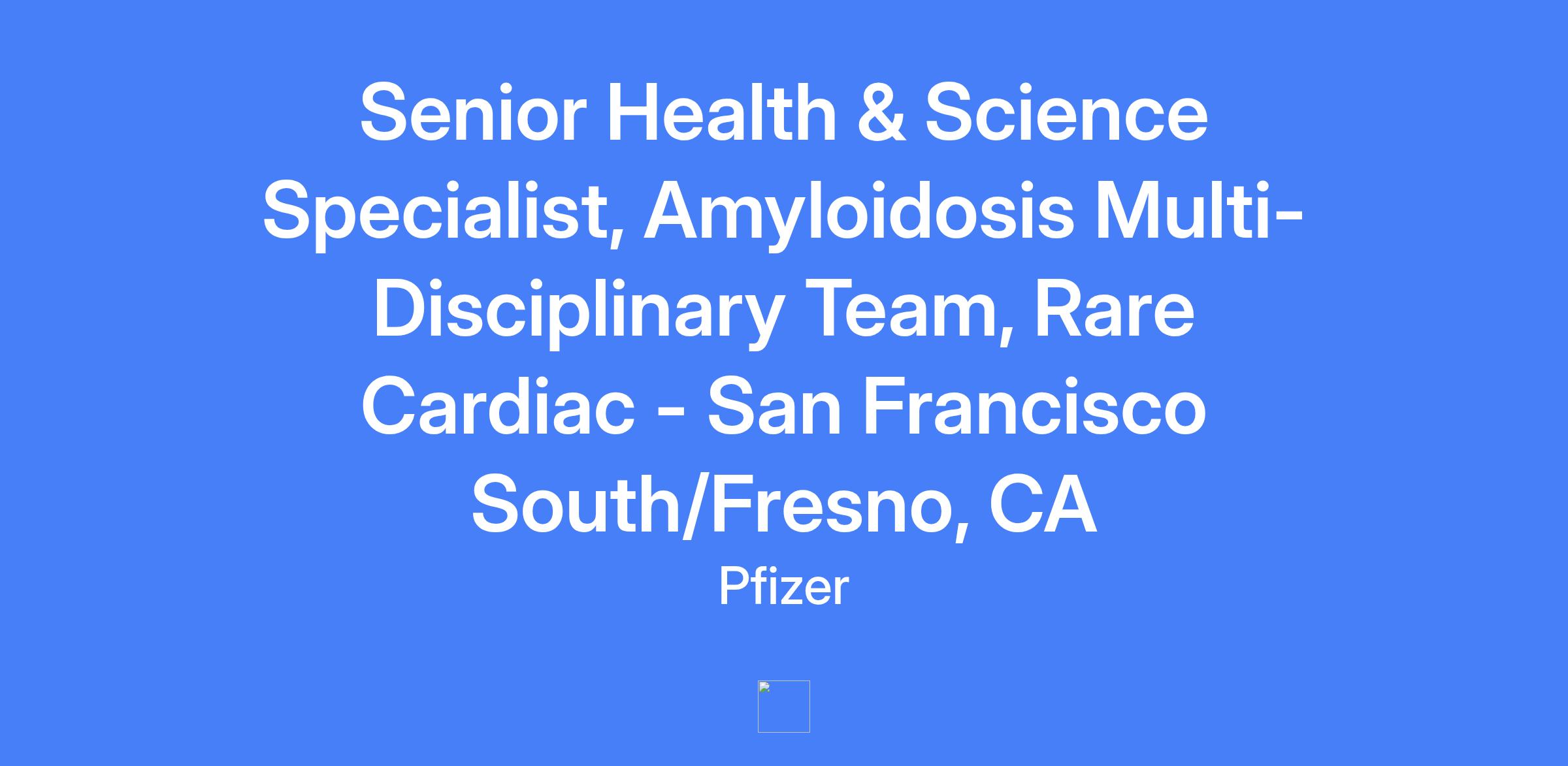 Senior Health & Science Specialist, Amyloidosis Multi-Disciplinary Team, Rare Cardiac โ San Francisco South/Fresno, CA. Provides disease awareness and strategic engagement with healthcare providers to accelerate new patient starts through increased disease state awareness in designated territories. Applies strong business acumen and in-depth knowledge of ATTR-CM and related procedures to develop and execute territory plans in collaboration with Rare Cardiac colleagues. Adheres to all company policies and regulatory requirements.