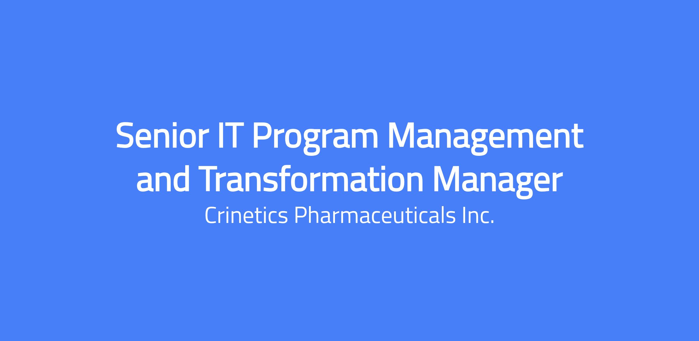 Crinetics is a pharmaceutical company based in San Diego, California, developing much-needed therapies for people with endocrine diseases and endocrine-related tumors. We were founded by a dedicated team of scientists with the simple belief that better therapies developed from rigorous innovation can lead to better lives. Our work continues to make a real difference in the lives of patients. We have a prolific discovery engine and a robust preclinical and clinical development pipeline. We are driven by science with a patient-centric and team-oriented culture. Crinetics is known for its inclusive workplace culture. We are also a dog-friendly workplace. This is an exciting time to join Crinetics as we shape our organization into the world’s premier fully-integrated endocrine company from discovery to patients. Join our team as we transform the lives of others. Position Summary: Crinetics Pharmaceuticals is seeking a highly motivated and strategic Senior Manager of IT Program Management & Transformation to lead the successful delivery of cross-functional technology initiatives while driving organizational change and user adoption. This role is critical in ensuring IT-driven projects not only meet business objectives but are embraced by stakeholders across the organization. This individual will partner closely with IT leadership, IT Operations & Risk Mgmt, functional business teams, external vendors, and change agents to manage program timelines, risks, budgets, and communications—while also deploying structured change management strategies to prepare, support, and enable end users. The ideal candidate brings a balanced blend of project delivery discipline and human-centered change leadership. Essential Job Functions and Responsibilities: These may include but are not limited to: Lead the planning, execution, and delivery of medium-to-large IT projects and programs across infrastructure, applications, SaaS, and business systems. Define and manage project scope, schedules, risks, budgets, and deliverables using project management best practices (e.g., Agile, Waterfall, hybrid). Coordinate internal teams, third-party vendors, and cross-functional stakeholders to ensure timely, quality delivery. Prepare and present program status updates and risks to IT and business leadership. Manage vendor engagements, including scope, service delivery, and SLAs. Apply structured change management methodologies (e.g., Prosci, ADKAR) to support user readiness and adoption of new systems and processes. Assess change impacts and develop plans for communication, stakeholder engagement, training, and resistance management. Develop and deliver change communications in collaboration with corporate communications and business leads. Act as a partner for senior leaders and project sponsors to help them fulfill their change leadership roles. Partner with IT Operations & Risk Mgmt, IT Business Partners, IT PMO, , and business stakeholders to align project and change initiatives with broader organizational goals. Drive a culture of continuous improvement, learning, and shared accountability within the IT organization. Contribute to the development and maturation of IT project and change management capabilities, tools, and templates. Other duties as assigned. Education and Experience: Required: Bachelor's degree in Information Technology, Business Administration, Organizational Development, or a related field; Master's degree or MBA is a plus. 12+ years of progressive experience in IT project management, program delivery, or change management roles. Proven experience leading complex IT projects or programs involving systems implementation, process transformation, or digital enablement. Formal training and certification in project management (e.g., PMP, PMI-ACP, Agile Product Delivery) and/or change management (e.g., Prosci, CCMP) strongly preferred. Experience in life sciences, biotech, healthcare, or similarly regulated industries a plus. Excellent communication, facilitation, and stakeholder engagement skills. Ability to navigate ambiguity, work across multiple initiatives, and influence without authority. Preferred: Highly organized and precise, with great attention to detail. Skilled communicator with a focus on customer service to resolve issues effectively. Physical Demands and Work Environment: Physical Activities: On a continuous basis, sit at desk for a long period of time; intermittently answer telephone and write or use a keyboard to communicate through written means. Some walking and lifting up to 25 lbs. may be required. The noise level in the work environment is typically low to moderate. The physical demands described above are representative of those that must be met by an employee to successfully perform the essential functions and responsibilities of this job. Reasonable accommodations may be made to enable individuals with disabilities to perform the essential functions and responsibilities. Laboratory Activities (if applicable): Biology and chemical laboratory environment experience needed. Environmental health and safety requirements also apply. Travel: You may be required to travel for up to 5% of your time. Equal Opportunity Employer: Crinetics is proud to be an Equal Opportunity Employer. We provide equal employment opportunities to all employees and employment applicants without regard to unlawful considerations of sex, sexual orientation, gender (including gender identity and/or expression), pregnancy, race, color, creed, national or ethnic origin, citizenship status, religion or similar philosophical beliefs, disability, marital and civil union status, age, genetic information, veteran status or any personal attribute or characteristic that is protected by applicable local, state or federal laws. Salary Range The salary range for this position is: $144,000 - $180,000. In addition to your base pay, our total rewards program consists of a discretionary annual target bonus, stock options, ESPP,