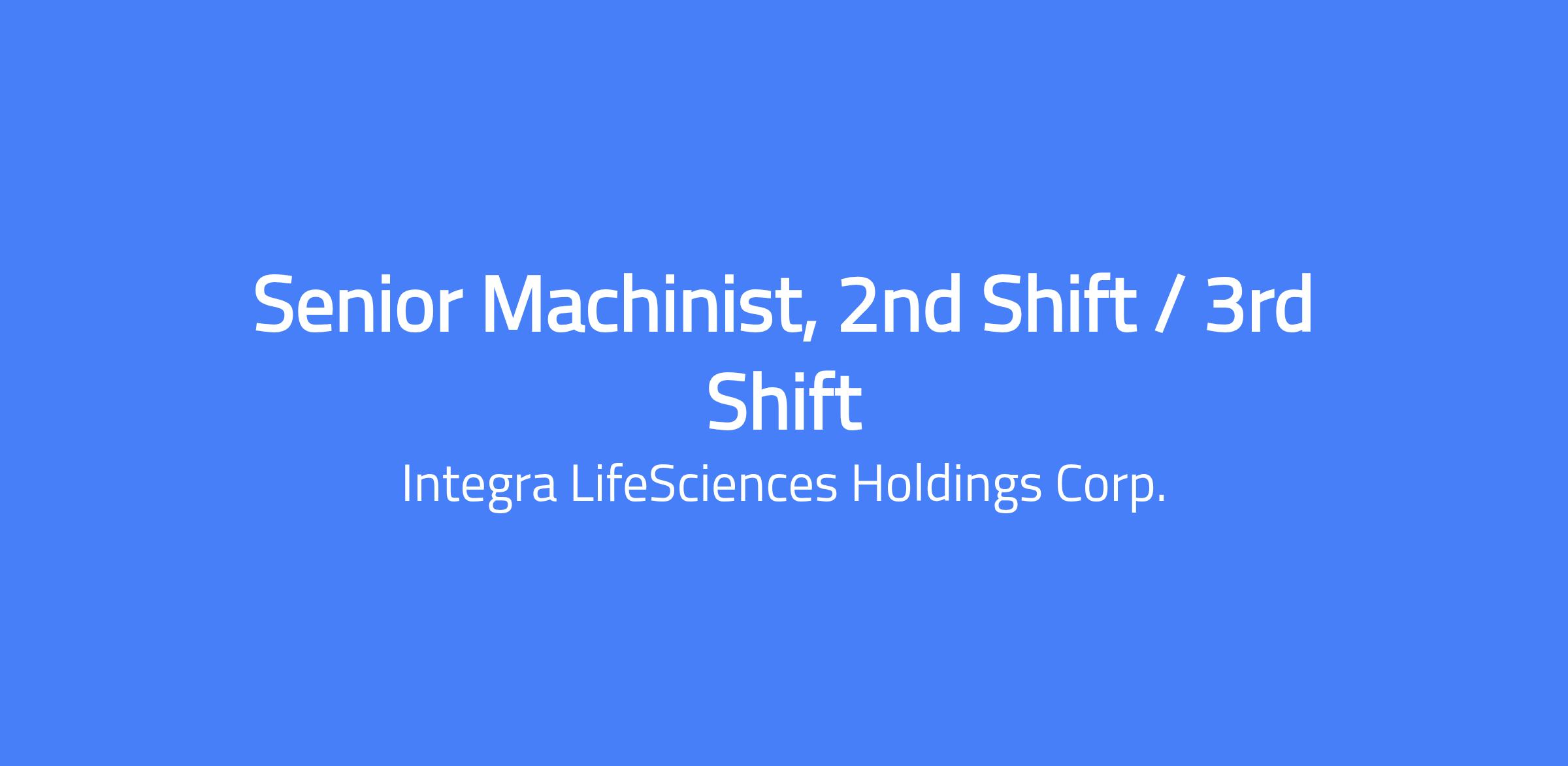 Changing lives. Building Careers. Joining us is a chance to do important work that creates change and shapes the future of healthcare. Thinking differently is what we do best. To us, change equals opportunity. Every day, our colleagues are challenging whatâs possible and making headway to innovate new treatment pathways to advance patient outcomes and set new standards of care. Performs all phases of machining, finishing and assembly in a job shop or high-volume applications. Processes components to meet print and or geometric tolerance requirements. Responsible for the setup, operation and maintenance of production machinery, maintenance of proper documentation and support of the manufacturing engineering function. To perform this job successfully, an individual must be able to perform each essential duty satisfactorily. Primary responsibilities are to: Performs programming. Performs set up of manual and CNC machines including loading of tools, troubleshooting, programming adjustments and tear-down. With limited supervision, completes tasks as directed by SOPs, routers, prints, work instructions and manufacturing schedules. Operates machining equipment with an understanding of machining and metal removal concepts which may include milling, turning, grinding and other methods. Observes operation of machine and verifies conformance of machined work pieces to specifications using measuring instruments such as fixed gauges, calipers and micrometers. Adheres to dimensions and tolerances found on prints. May use prints and sketches to determine proper methods and processes. Performs machine set up. Demonstrates a high degree of proficiency in the selection and care of special machine tools such as drills, jigs, mills, lathes and fixtures. Diagnoses machine problems using proper diagnostic tools. Maintains CNC program files. Maintains machine maintenance files. Reworks productions part and perform emergency rework and/or modification of production parts as directed. Modifies existing processes if necessary. Inspects prototypes, machines prototype fixtures and First Article components. Performs in-process checks using measuring devices and reports defective materials or questionable conditions to the department lead person or supervisor. Maintains the work area and equipment in a clean and orderly condition and follows prescribed safety regulations. Trains other employees. Works on projects as part of a team, exchanging ideas and contributing skills that complement those of the other team members. Fulfills commitments to team members. Performs assembly, deburring and other duties as required. Note: Other duties may be assigned as necessary. QUALIFICATIONS The requirements listed below are representative of the knowledge, skill and/or ability required for this position. High School diploma or equivalent. 5+ years of related experience with trade school certification preferred where applicable. Considerable knowledge of the machinist role and complete acquaintance with an understanding of the machining of routine parts and ability to practically apply solutions to routine problems. Understanding of FDA device manufacturing requirements. Salary Pay Range: $25.96 - $35.58 USD Hourly Our salary ranges are determined by role, level, and location. Individual pay is determined by several factors including job-related skills, experience, and relevant education or training. In addition to base pay, employees may be eligible for bonus, commission, equity or other variable compensation. Your recruiter can share more about the specific salary range for your preferred location during the hiring process. Additional Description for Pay Transparency: Subject to the terms of their respective plans, employees and/or eligible dependents are eligible to participate in the following Company sponsored employee benefit programs: medical, dental, vision, life insurance, short- and long-term disability, business accident insurance, and group legal insurance, and savings plan (401(k)). Subject to the terms of their respective policies and date of hire, Employees are eligible for the following https://jobs.integralife.com/total-rewards/ Integra LifeSciences is an equal opportunity employer, and is committed to providing equal employment opportunities to all qualified applicants and employees regardless of race, marital status, color, religion, sex, age, national origin, sexual orientation, physical or mental disability, or protected veteran status. This site is governed solely by applicable U.S. laws and governmental regulations. If you'd like more information on your rights under the law, please see the following notices: EEO Is the Law | EOE including Disability/Protected Veterans Integra LifeSciences is committed to provide qualified applicants and employees who are disabled veterans or individuals with disabilities with needed reasonable accommodations in accordance with the ADA. If you have difficulty using our online system due to a disability and need an accommodation, please email us at careers@integralife.com. Unsolicited Agency Submission Integra LifeSciences does not accept unsolicited assistance from search firms for employment opportunities. All CVs/resumes submitted by search firms to any employee at our company without a valid written search agreement in place for this position will be deemed the sole property of our company. No fee will be paid in the event a candidate is hired by our company as a result of an agency referral where no pre-existing agreement is in place. A formal written agreement is required before engaging any agency, and it must be executed and authorized by the Vice President, Talent Acquisition. Where agency agreements are in place, introductions (the initial sharing of a candidateâs name, resume, or background) are position-specific and may only occur within the scope of that approved agreement. Please, no phone calls or emails. Integra - Employer Branding from Integra LifeSciences 