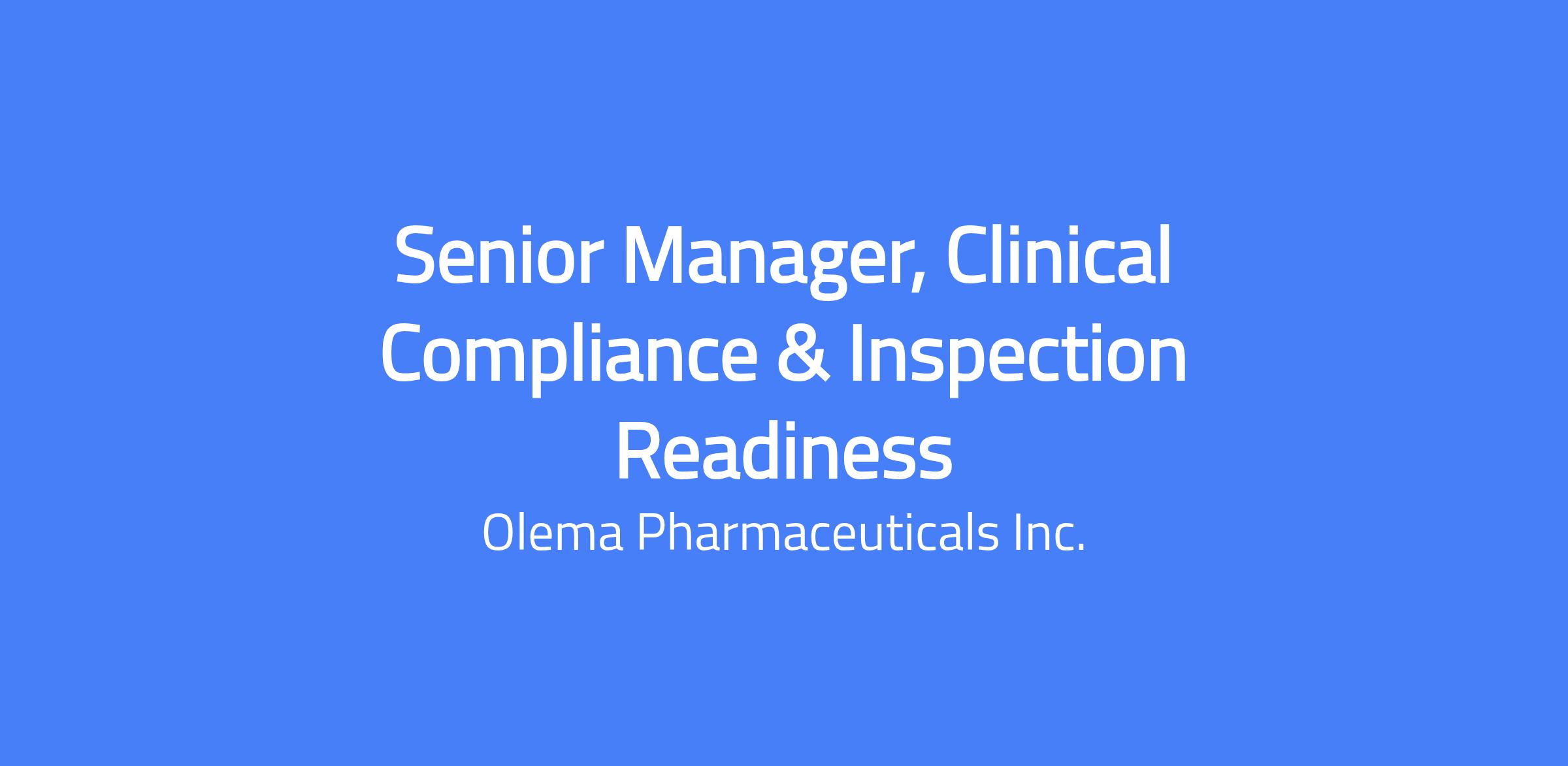 As the Senior Manager, Clinical Compliance & Inspection Readiness reporting to the Senior Director, Clinical Compliance & Documentation you will be responsible for supporting the advancement of Olema’s clinical studies by ensuring clinical quality, GCP adherence, procedural development / SOP management, process improvements, risk management, and training.  This role will collaborate cross-functionally to provide solution-orientated compliance guidance, drive best practices, create tools, implement lessons learned, and improve future capabilities that overall, enhance the effectiveness of compliant clinical study execution and “Real Time” Inspection Readiness. In addition, this person will support inspection readiness activities by completing study performance health checks through Key Performance Indicators (KPIs), supporting storyboard creation, and participating in regulatory inspection preparation activities.Â