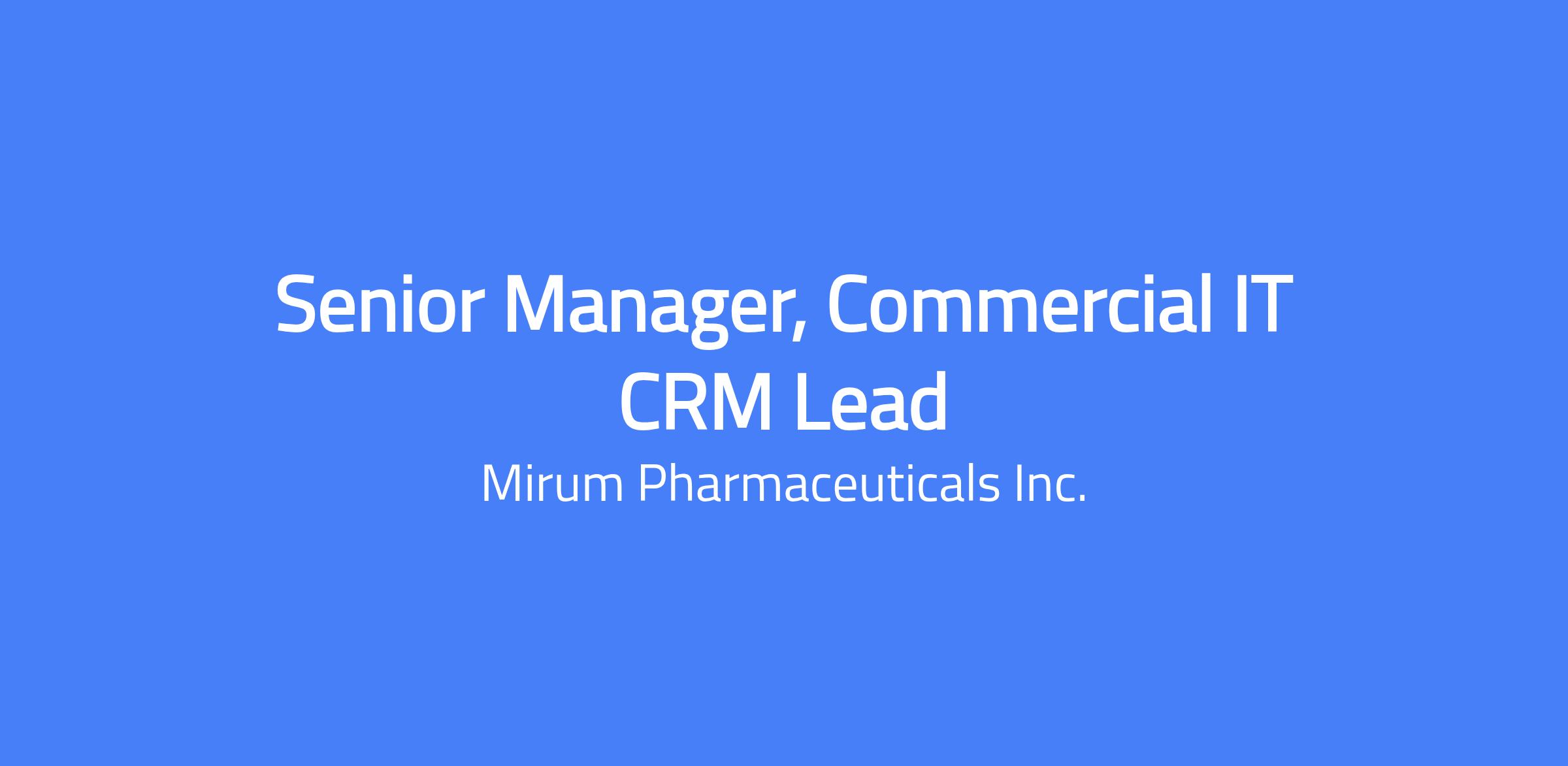 This role will be responsible for owning and supporting Mirum’s Salesforce Life Sciences Cloud (SFLC) platform that powers the Patient CRM and HCP Portal. This Senior Manager role serves as the IT Platform lead with primary accountability for platform stabilization, operational excellence, and scalability following initial implementation and go-live of the Patient Services Hub. Over time, this role will expand to support additional Commercial systems related to customer engagement platforms. The ideal candidate is a highly skilled CRM platform leader with deep experience in regulated life sciences environments, complex CRM implementations, and cross-system integrations.