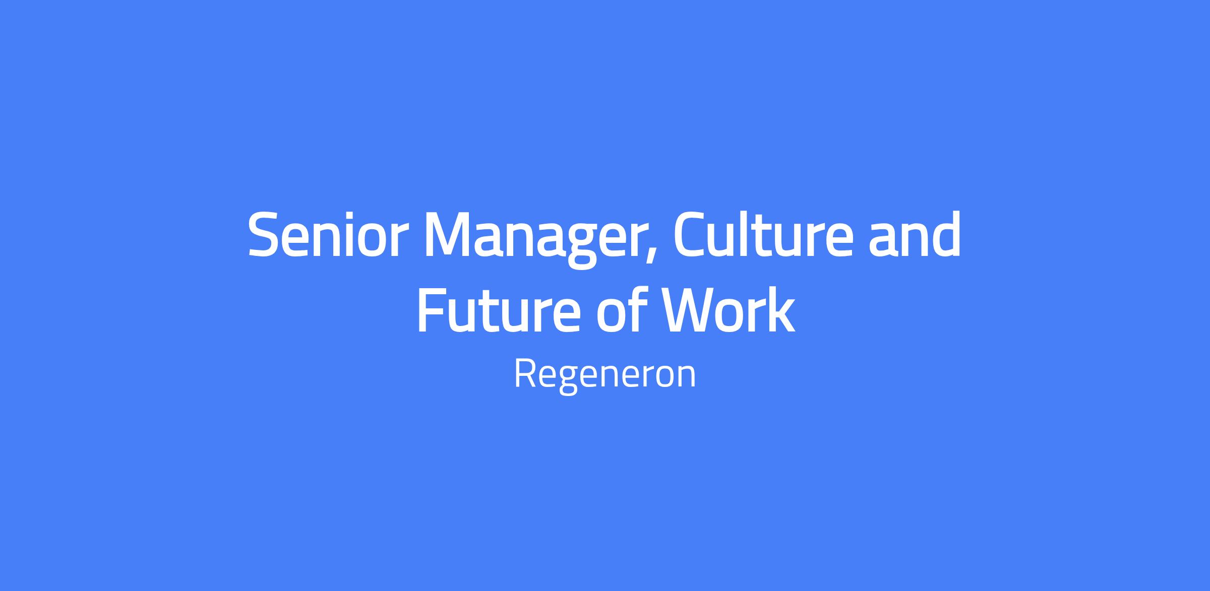 We are seeking a forward-thinking Senior Manager, Culture & Future of Work to shape how our people, culture, and technology come together to drive the next era of innovation at Regeneron. This role is at the intersection of employee experience, organizational culture, and technology enablement, ensuring that we stay future-ready while keeping human connection at the center of how we work. You will blend strategy, research and design to help translate emerging insights into real, tested solutions that enhance how teams collaborate, innovate, and thrive. This is an opportunity to help define the Future of Work in a science-driven, innovation-focused company. You’ll lead initiatives that bring together culture, engagement, and technology to create a better workplace that fuels better science and a better world. This role will require 4 days per week onsite at our Corporate HQ Campus in Sleepy Hollow, NY. This is not available as a fully remote / hybrid work.
