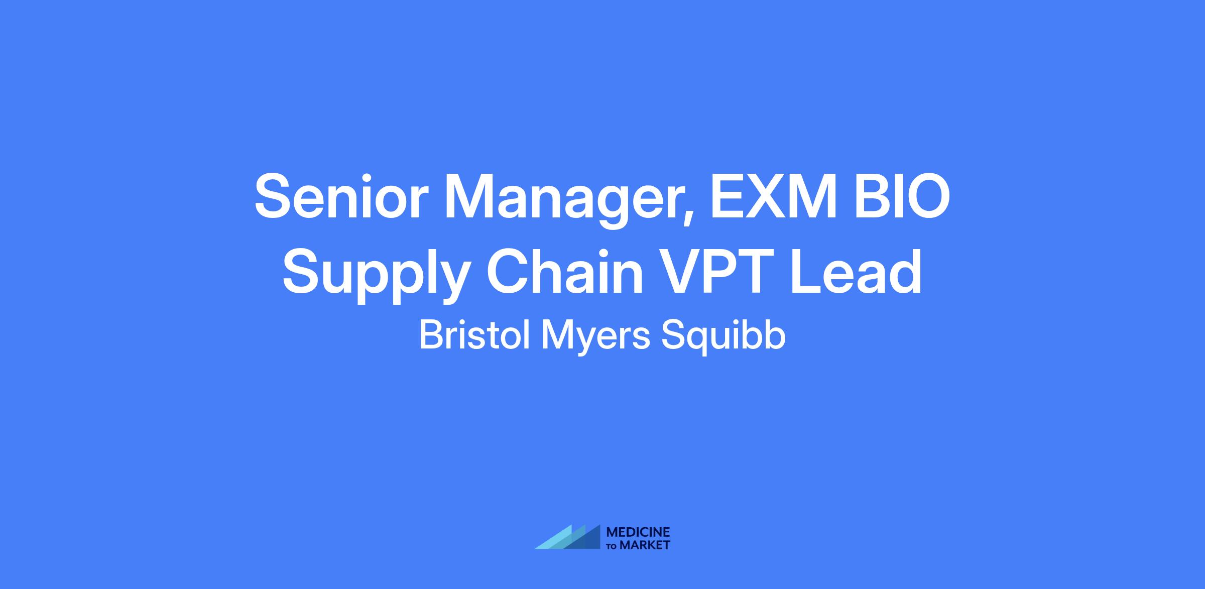 Senior Manager, EXM BIO Supply Chain VPT Lead. The Senior Manager, Supply Chain - VPT acts as the bridge between the CMO and the wider BMS Supply Chain team, ensuring effective communication of supply chain information within BMS and with CMOs, and driving supply chain improvements with the CMO.