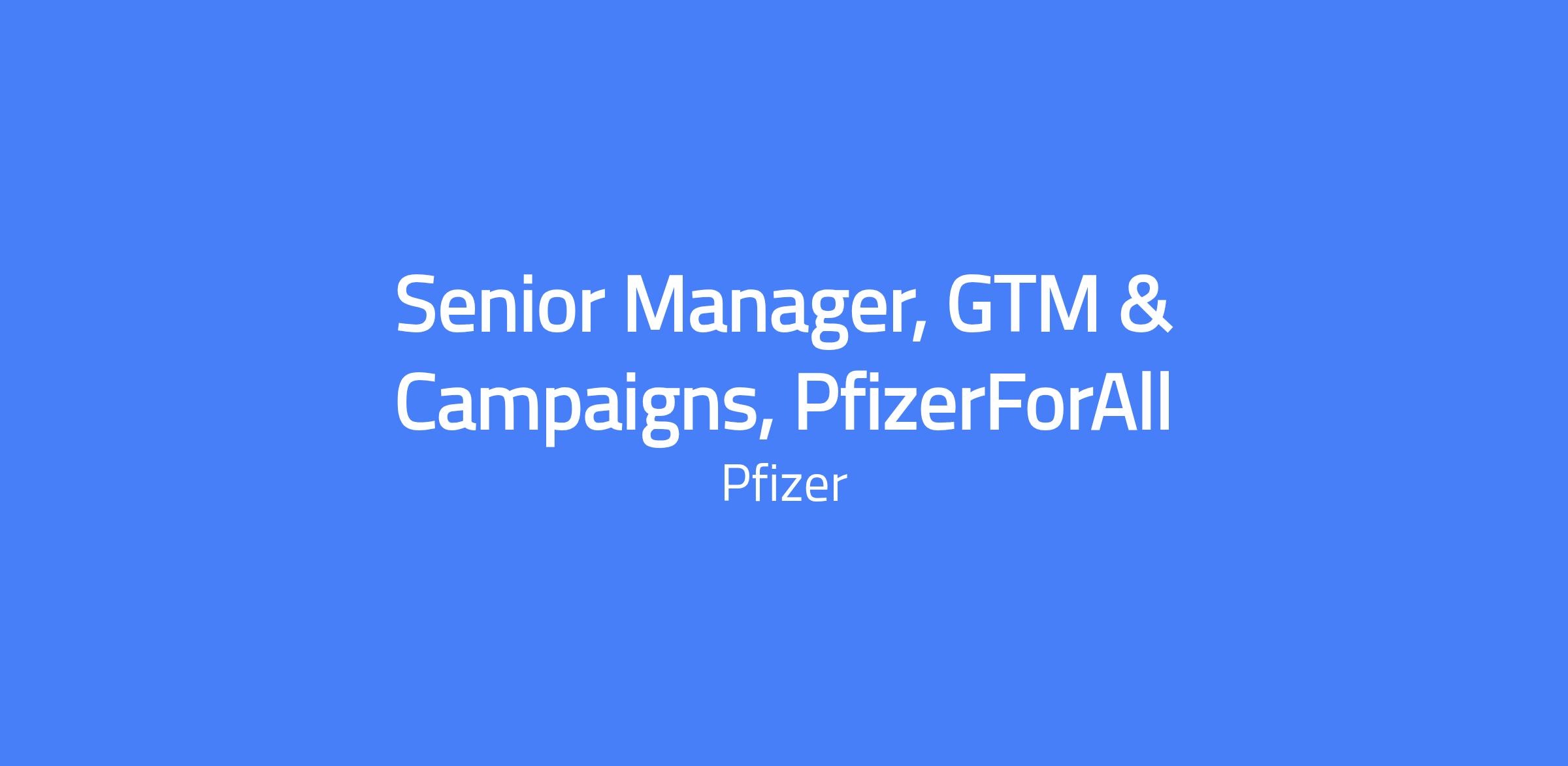 Senior Manager, GTM & Campaigns for PfizerForAll leads go-to-market strategies and promotional plans for key therapeutic areas, ensuring branded experiences, campaigns and capabilities are delivered with speed, quality and compliance. The role connects patients to Pfizer and partner resources, driving KPIs and strengthening Pfizer brand equity and trust. This is a hands-on role that bridges marketing, digital products, innovation and operations to deliver a cohesive consumer experience across paid, owned, earned and shared channels.