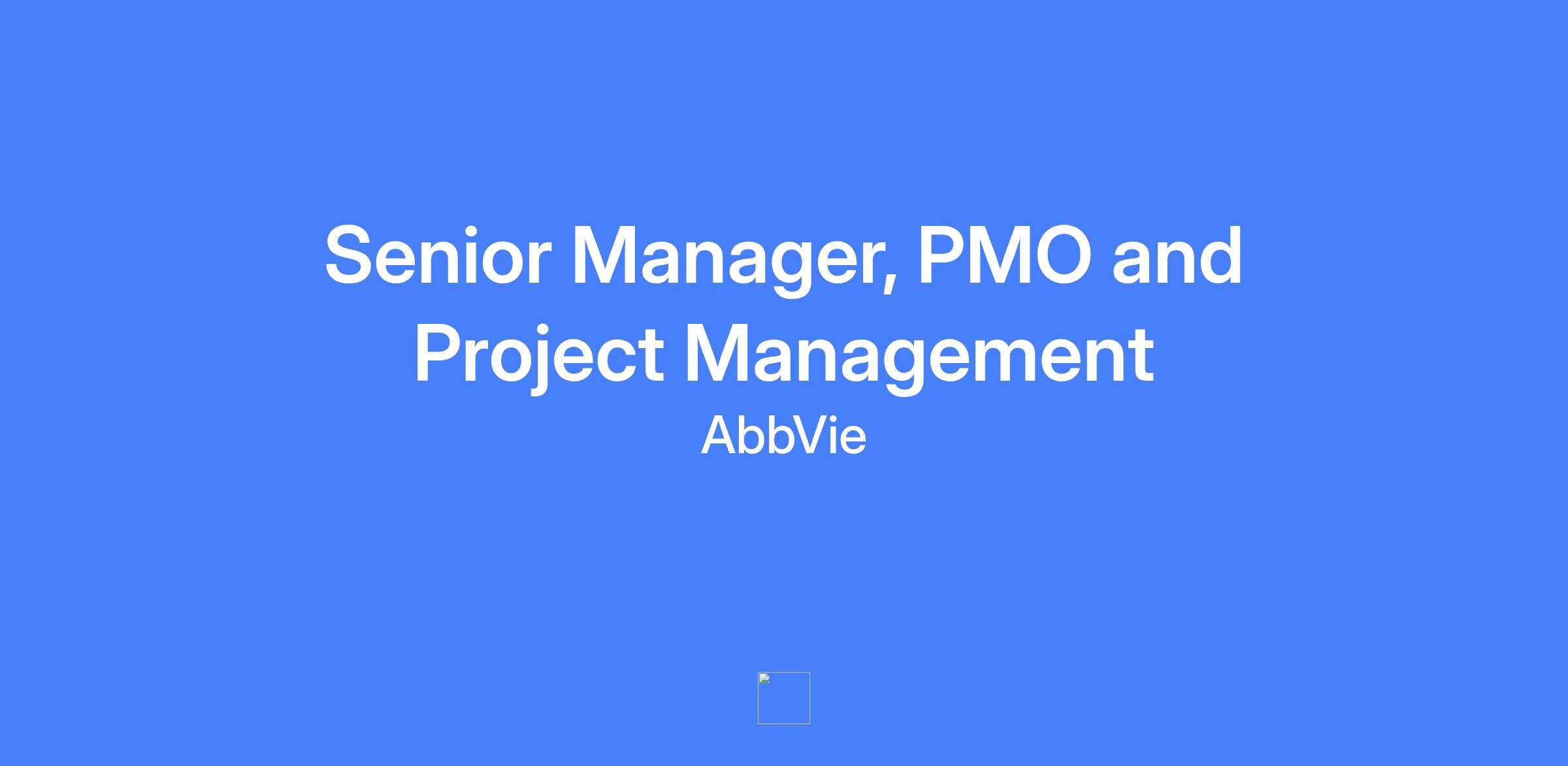 Senior Manager, PMO and Project Management at AbbVie. Accountable for governance and execution of the project management office, leading a team of project managers to standardize processes, govern projects, track metrics, and drive capacity forecasting and resource planning across manufacturing, quality, systems, and business processes. Onsite role requiring presence five days per week.