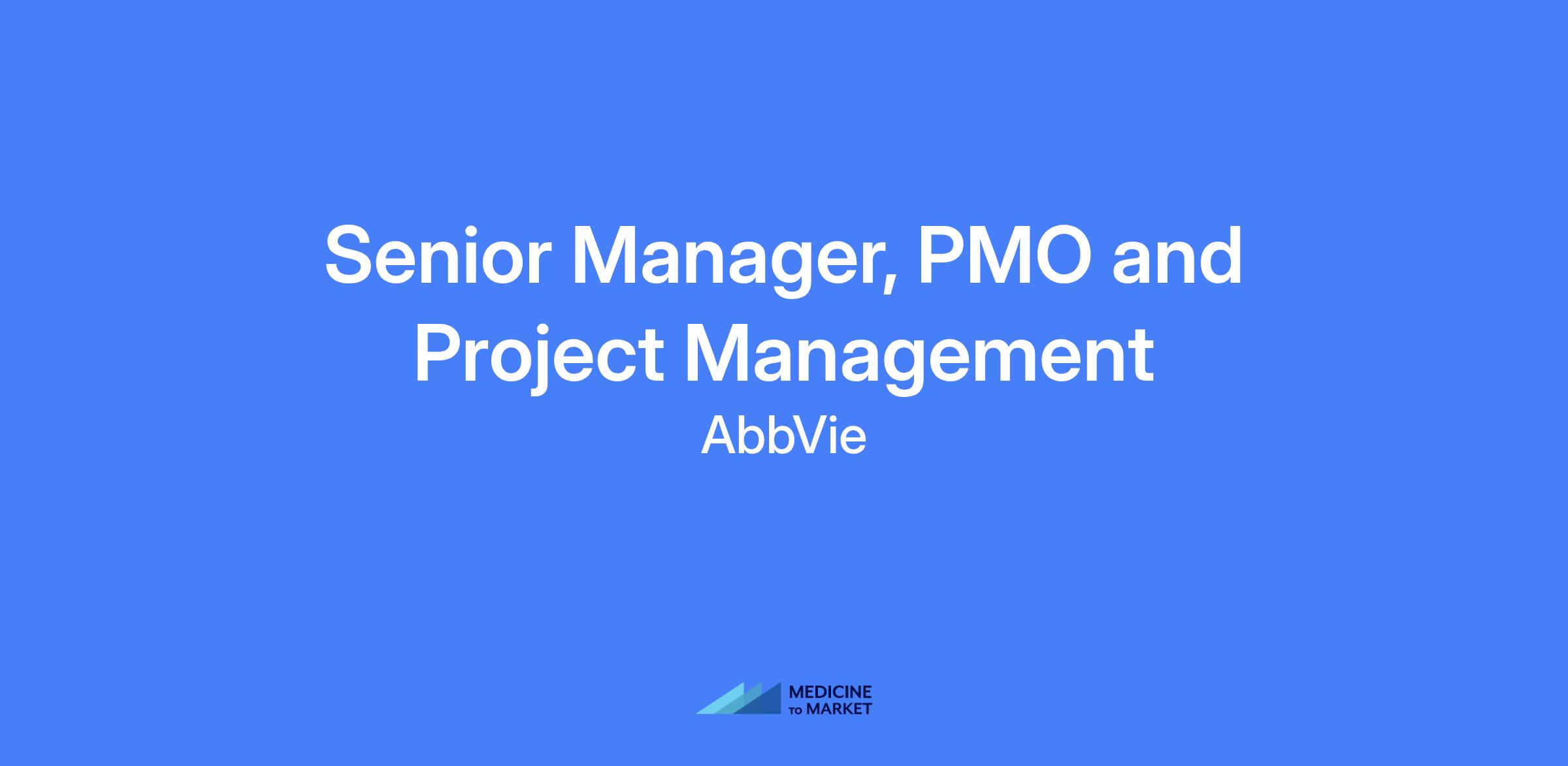 Senior Manager, PMO and Project Management at AbbVie. Accountable for governance and execution of the project management office, leading a team of project managers to standardize processes, govern projects, track metrics, and drive capacity forecasting and resource planning across manufacturing, quality, systems, and business processes. Onsite role requiring presence five days per week.