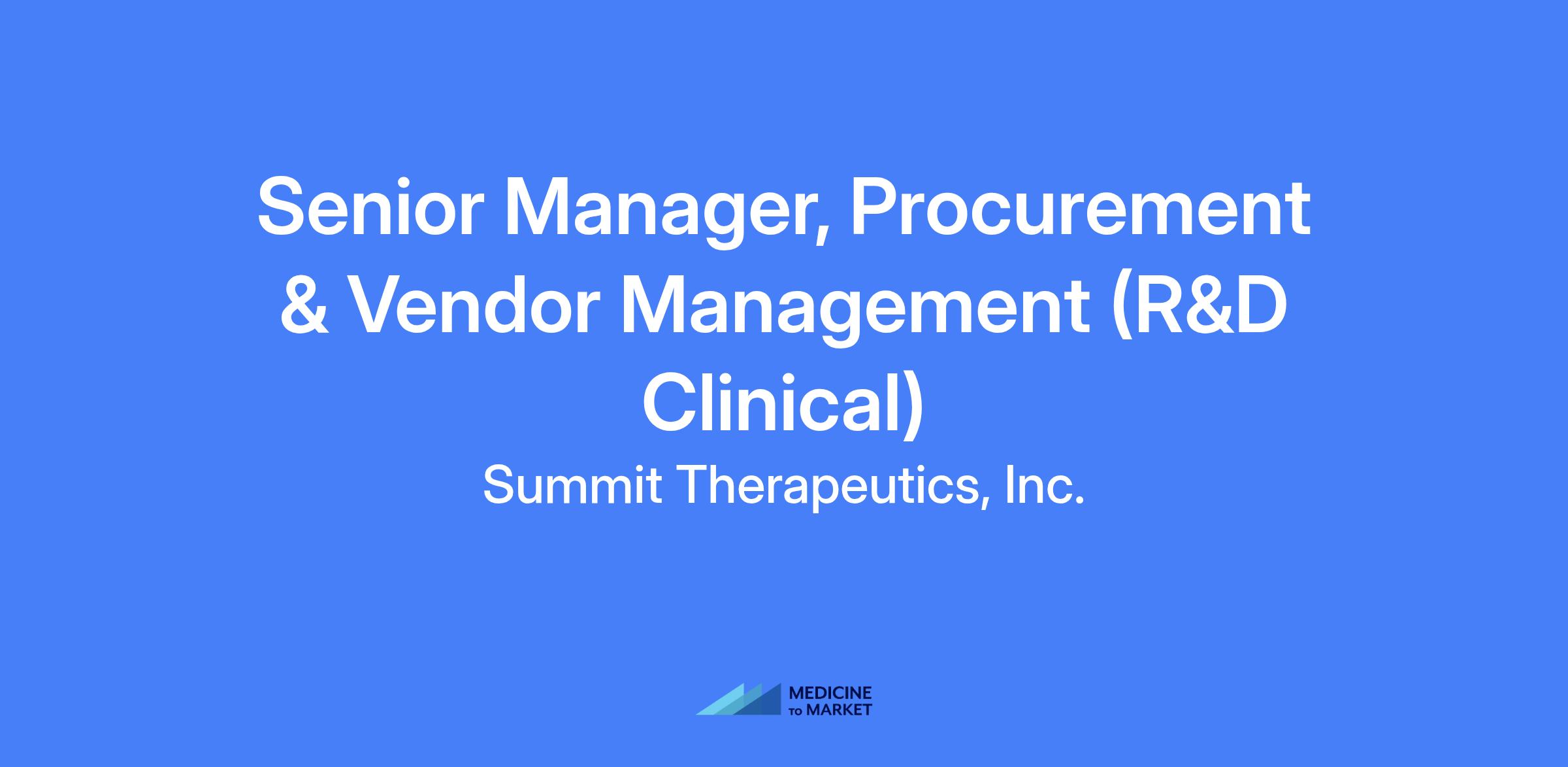 The Senior Manager, Procurement & Vendor Management (R&D Clinical) will lead sourcing strategy, contracting, and governance activities across Summitโรรดs global clinical research and development organization. This individual will report into the Head/Senior Director of Procurement and Vendor Management. The successful incumbent will be responsible for all phases of clinical study execution such as CROs, central labs, and other specialty clinical suppliers across R&D. The role ensures that vendors deliver high-quality, compliant, and cost-effective services aligned with Summitโรรดs clinical and operational goals. Moving forward, this role could expand to take on other additional responsibilities across R&D and in Procurement.