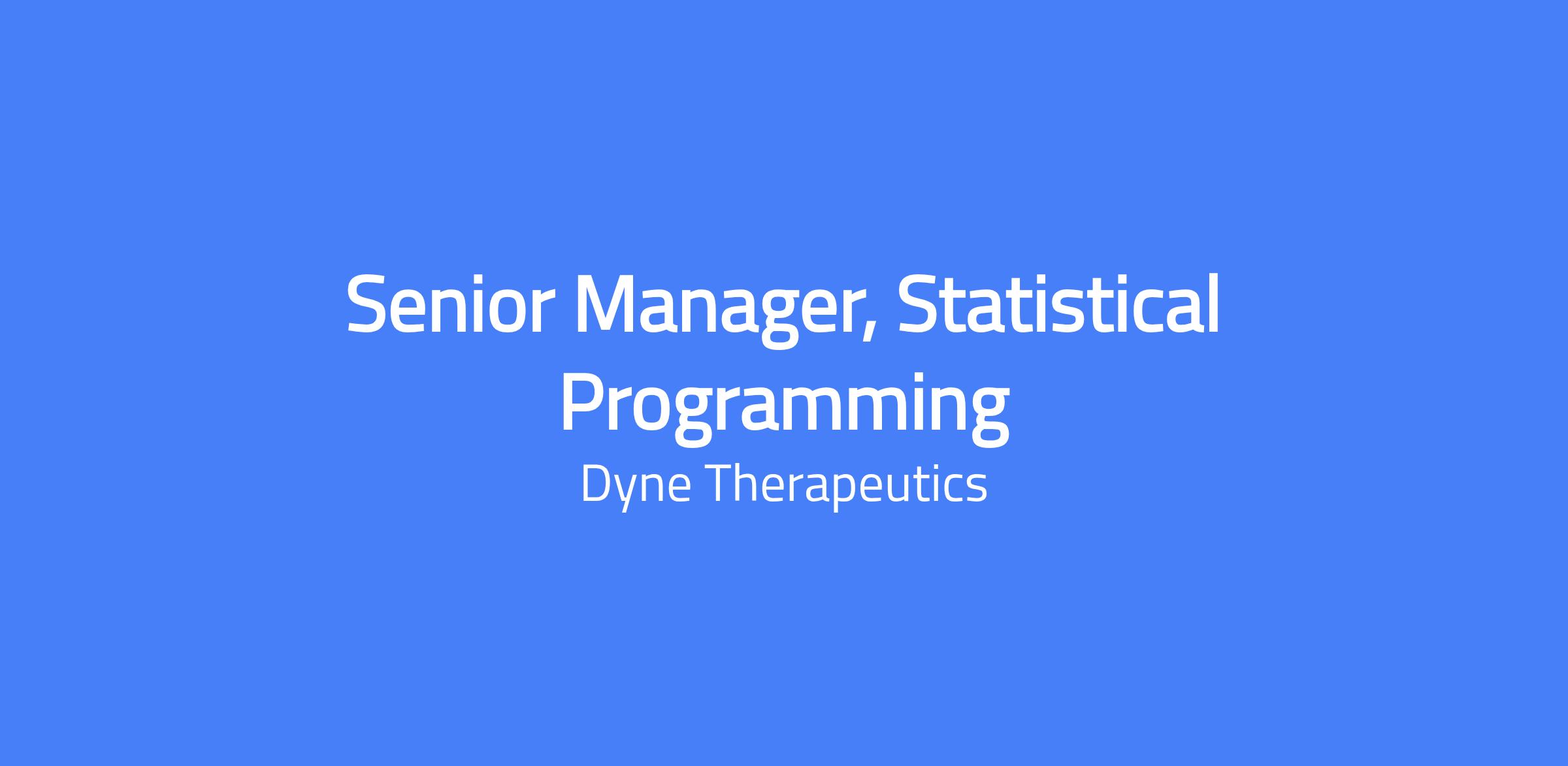 The Senior Manager, Statistical Programming serves as the statistical programming lead for a defined number of clinical studies, with accountability for all study-level statistical programming activities conducted in-house and/or through vendor oversight. This role is the primary point of contact for statistical programming and data standards for assigned studies, providing technical leadership and consultation to cross-functional program teams. The Senior Manager also supports the planning and resourcing of statistical programming activities to ensure timely and high-quality delivery across the Dyne clinical portfolio. This position contributes to departmental strategy, as well as the development and continuous improvement of programming procedures, training, and standards. This is a full-time position based in Waltham, MA.