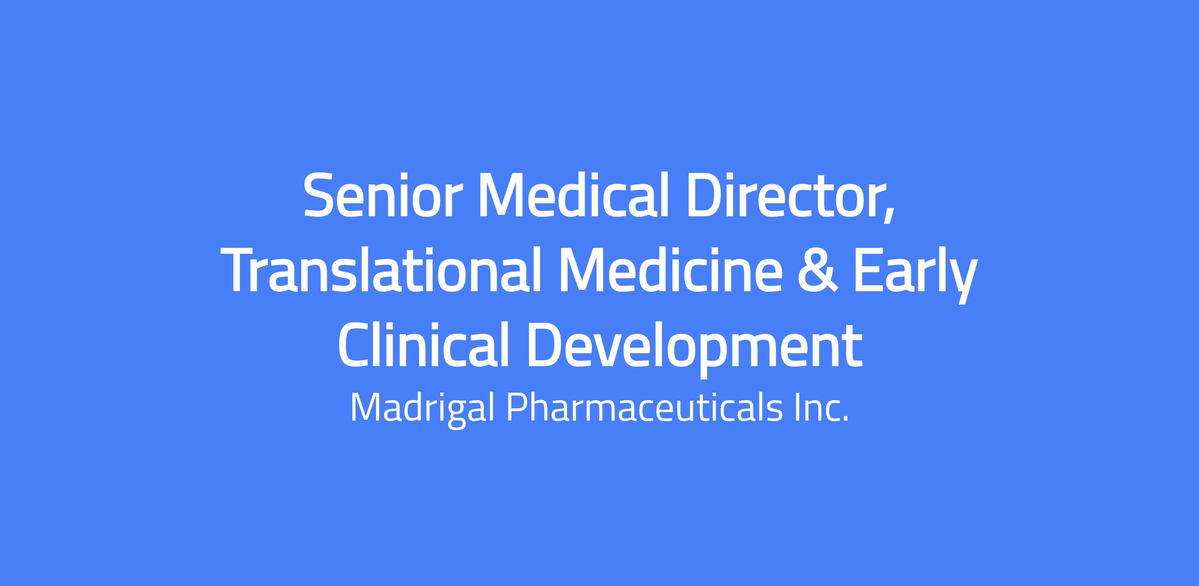 Madrigal is a biopharmaceutical company focused on delivering novel therapeutics for metabolic dysfunction-associated steatohepatitis (MASH), a serious liver disease that can progress to cirrhosis, liver failure, need for liver transplantation and premature mortality. Every member of our Madrigal team is connected by our shared purpose: leading the fight against MASH. Madrigal芒聙聶s medication, Rezdiffra (resmetirom), is a once-daily, oral, liver-directed THR-脦虏 agonist designed to target key underlying causes of MASH. Rezdiffra is the first and only medication approved by both the FDA and European Commission for the treatment of MASH with moderate to advanced fibrosis (F2 to F3). An ongoing Phase 3 outcomes trial is evaluating Rezdiffra for the treatment of compensated MASH cirrhosis (F4c). Our success is driven by our people. We are building a dynamic, inclusive, and high-performing culture that values scientific excellence, operational rigor, and collaboration. To support our continued growth, we are strengthening our workforce strategy to ensure we have the right talent, at the right time, in the right way. The Senior Medical Medical Director, Translational Medicine & Early Clinical Development is a senior physician-scientist responsible for leading early development and mechanistic clinical studies and shaping the translational strategy across Madrigal芒聙聶s metabolic liver and cardiometabolic portfolio. This role will act as medical lead for first-in-human and early proof-of-concept studies (including mechanistic and indication-expansion trials), integrating clinical, biomarker, and mechanistic data to inform go/no-go decisions, label-enabling strategy, and lifecycle management. The role will be a key member and often chair of early asset / program teams and a close partner to Research, Clinical Development, Clinical Pharmacology, and Biostatistics. Key Responsibilities Clinical study leadership 脗路 Serve as global medical lead / medical monitor for early phase studies (e.g., FIH, PoC, mechanistic, and indication-expansion trials in MASH and related cardiometabolic/liver conditions). 脗路 Lead design of study concepts and protocols, including selection of patient populations, endpoints (clinical and biomarker), and mechanistic sub-studies. 脗路 Provide ongoing medical oversight of trials, including eligibility review, safety monitoring, dose decision-making, and interpretation of emerging data. 脗路 Partner with Clinical Operations and CROs to ensure high-quality execution, timely delivery of data, and inspection-readiness. Translational and biomarker strategy 脗路 Define and own the translational strategy for assigned programs, from preclinical to late-stage development, ensuring alignment between nonclinical and clinical plans. 脗路 Integrate pharmacokinetic, pharmacodynamic, biomarker, imaging, and clinical outcome data to build a coherent mechanistic narrative and inform dose/ regimen selection. 脗路 Oversee clinical biomarker plans for early and mechanistic studies, in close collaboration with Research, Biomarkers, and external labs/CROs. 脗路 Drive systematic banking and downstream analysis of biospecimens to enable future mechanistic and exploratory work. Cross-functional leadership and governance 脗路 Chair or co-chair early asset teams / translational working groups, defining objectives, deliverables, and decision points. 脗路 Partner with Clinical Development, Clinical Pharmacology, Regulatory Affairs, Biostatistics, Safety, and Commercial to ensure an integrated development strategy. 脗路 Provide high-quality clinical and mechanistic input into key documents (IB, CSR, TS/TPPs, regulatory briefing materials, publications, and presentations). 脗路 Present program and mechanistic work at internal governance forums and, where appropriate, to the Executive Team and Board. External Engagement 脗路 Build and maintain relationships with key external experts in MASH, cardiometabolic disease, and imaging/biomarker fields. 脗路 Lead or co-lead scientific collaborations with academic groups and consortia to address mechanistic questions and expand indications. 脗路 Represent the company at scientific and medical conferences, including presenting study and biomarker results. People and capability building 脗路 Provide day-to-day leadership and mentoring for junior physicians and PhD scientists within Translational Medicine/Early Clinical Development. 脗路 Help refine and evolve the operating model for Translational Medicine, including interfaces with Research and Clinical Development. Qualifications 脗路 MD with clinical training in a relevant specialty (e.g., hepatology, gastroenterology, endocrinology, cardiology, internal medicine) or equivalent. 脗路 15+ years relevant and industry experience in clinical development, including demonstrable leadership of early phase interventional trials. 脗路 Strong track record in translational medicine and biomarker-driven development; experience in metabolic liver or cardiometabolic disease strongly preferred. 脗路 Experience interacting with regulatory agencies on early development and biomarker topics is highly desirable. 脗路 Demonstrated ability to lead cross-functional teams, influence without authority, and operate effectively in a growing, evolving organization. 脗路 Excellent communication skills, with ability to articulate complex mechanistic concepts to diverse stakeholders (researchers, clinicians, executives, and board). Madrigal offers a competitive Total Rewards strategy to attract and retain top talent and is inclusive of base pay, bonus, equity, and a generous benefits package. Full-time employees are eligible for base salary, bonus, equity, and a comprehensive benefits suite. Base salary is determined by several factors including the candidate芒聙聶s qualifications, skills, education, experience, business needs, and market demands. As of the date of this posting, a 
