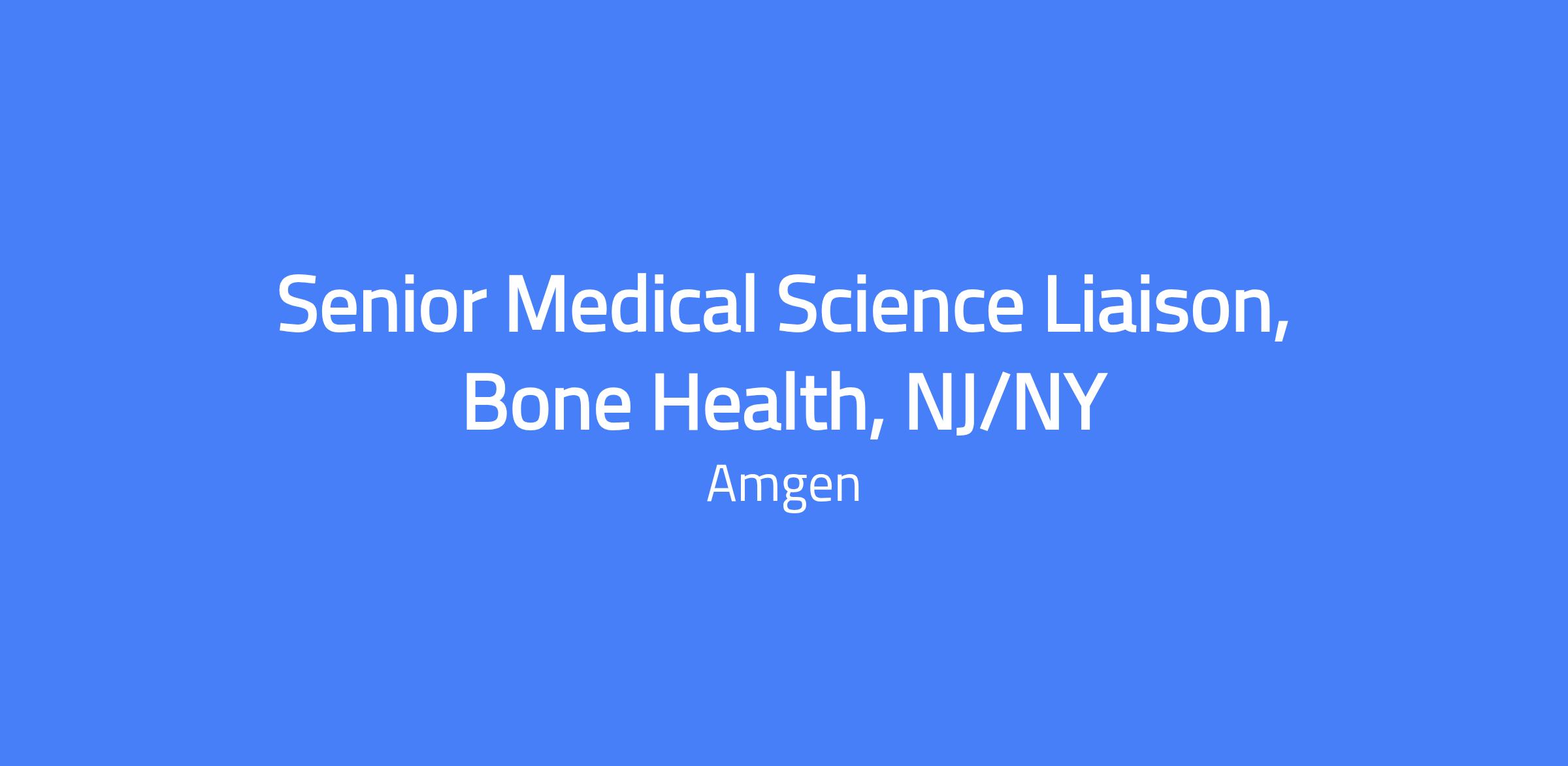 Senior Medical Science Liaison, Bone Health, NJ/NY. This field-based role covers NJ (north and central) and NY (Albany, Rochester, Syracuse) and serves as a primary scientific/clinical resource to key physicians and healthcare stakeholders. You will execute Amgen Medical function and product strategy to improve patient outcomes and support scientific exchange.