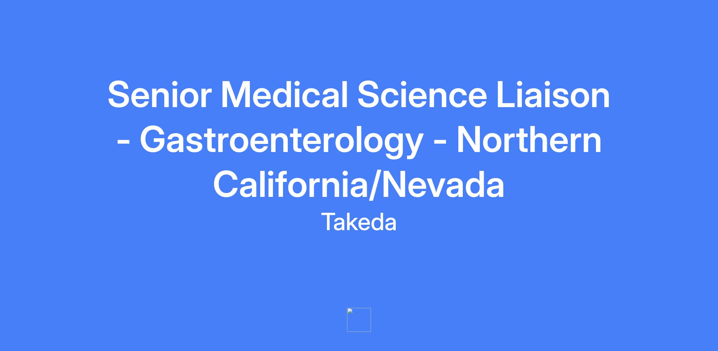 Senior Medical Science Liaison for Gastroenterology in Northern California/Nevada. Remote, field-based, external customer-facing role within the US therapeutic area medical unit, focused on analyzing, interpreting, and disseminating scientific data; acquiring and translating customer insights; fostering external expert networks; and connecting customers to Takeda to advance medical strategy and patient outcomes. Reports to the Director, Field Medical - West Gastroenterology. Territory includes Northern California (north of Bakersfield and San Luis Obispo) and Nevada; residence within territory is required.