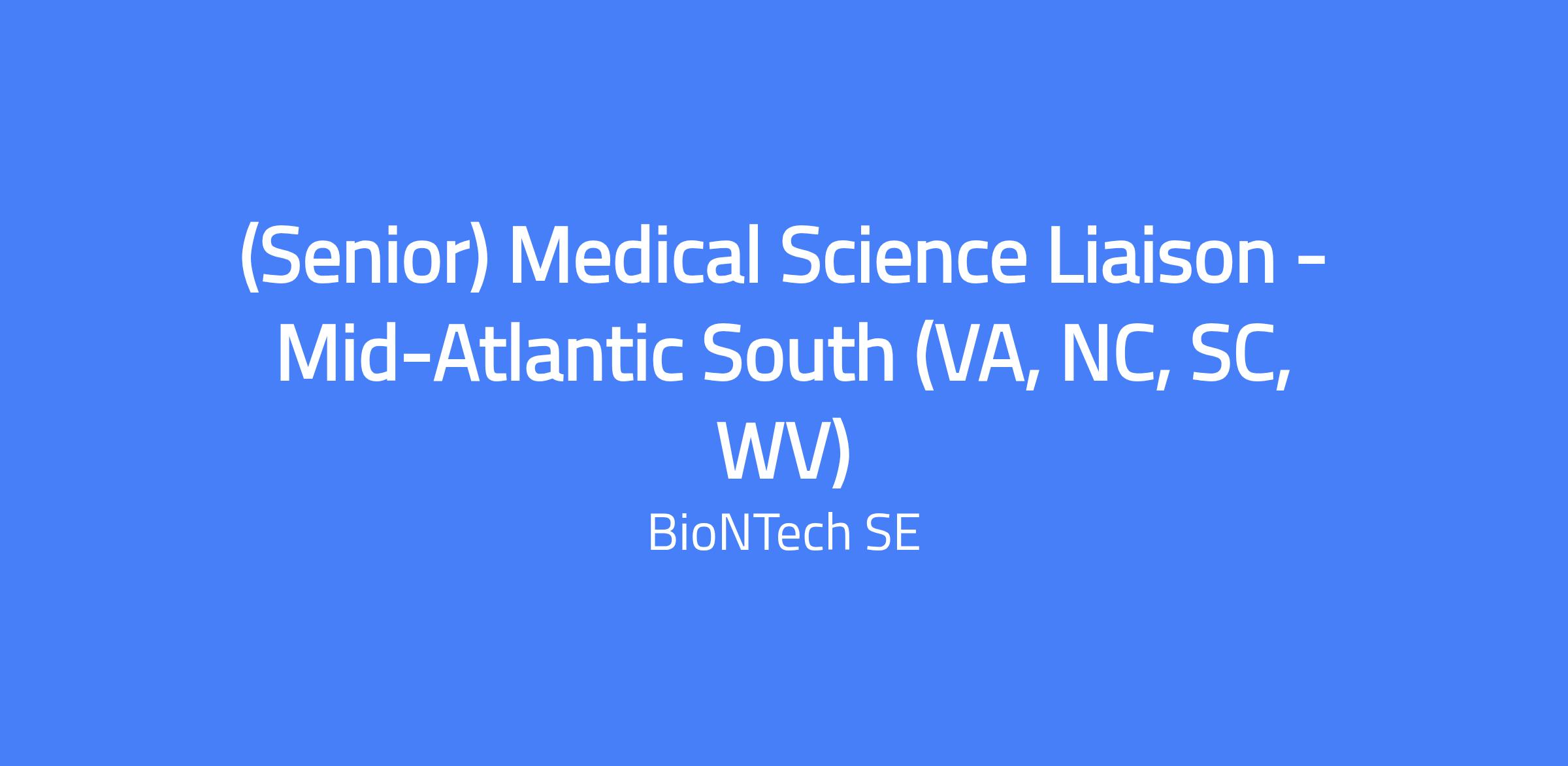 Mid-Atlantic South (VA, NC, SC, WV) – full-time role within BioNTech's Oncology Medical Affairs team. The (Senior) Medical Science Liaison will establish collaborations with external healthcare professionals, scientific experts, and institutions to share and discuss evidence-based information about the oncology/solid tumor R&D portfolio. You will be part of BioNTech's US field-based scientific/medical expert team, delivering medical education, updates, and gaining insights from U.S. healthcare professionals, and supporting clinical trial opportunities in the territory.