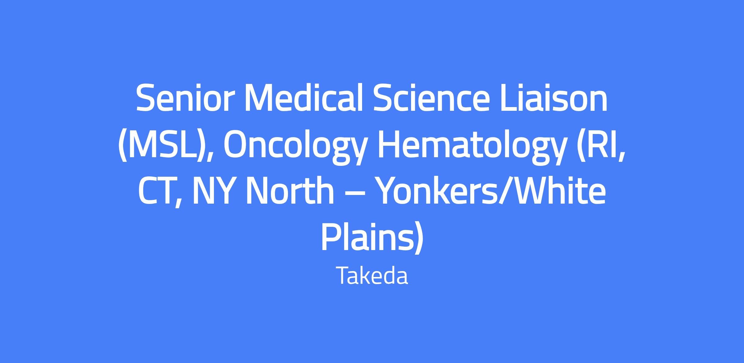 The Senior Medical Science Liaison (MSL) in Oncology/Hematology is a field-based role within the medical affairs team. The role supports the development and lifecycle management of Takeda Oncology medicines and engages scientifically with key opinion leaders in the assigned geography through accurate, scientific, and non-promotional information exchange. The territory for this role covers RI, CT, NY North β Yonkers/White Plains, and residency within the territory is required.