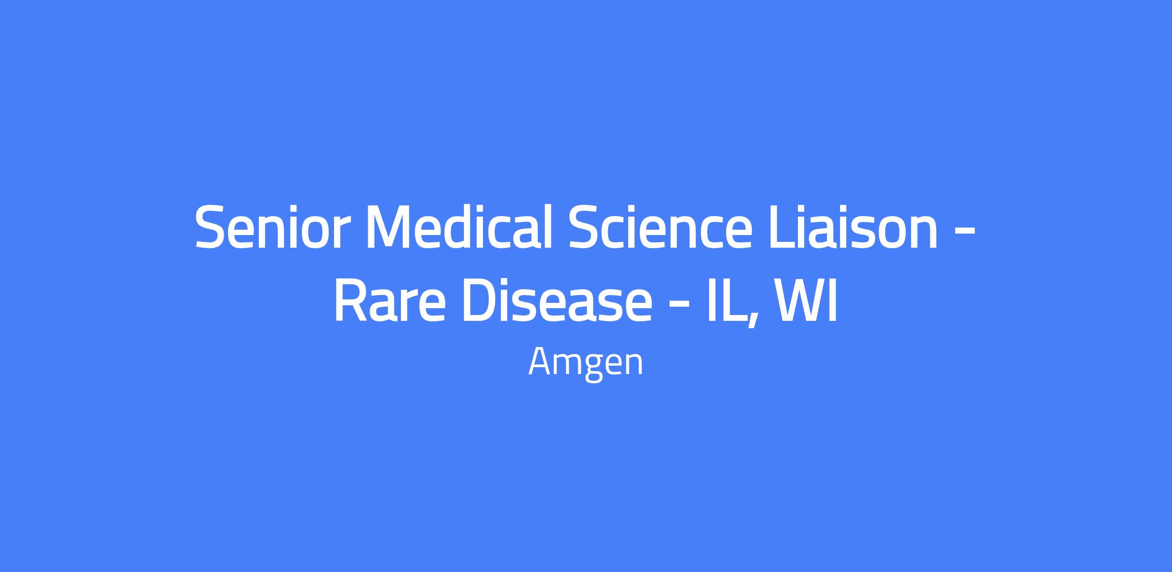 Senior Medical Science Liaison – Rare Disease, IL and WI. Serves as the primary scientific/clinical resource to Opinion Leaders, Population Health Decision Makers, and other healthcare providers, executing Amgen Medical function and product strategy to improve patient outcomes in the Rare Disease space (Severe Active MPA/GPA). Territory includes Illinois (Chicago Metro) and Wisconsin.
