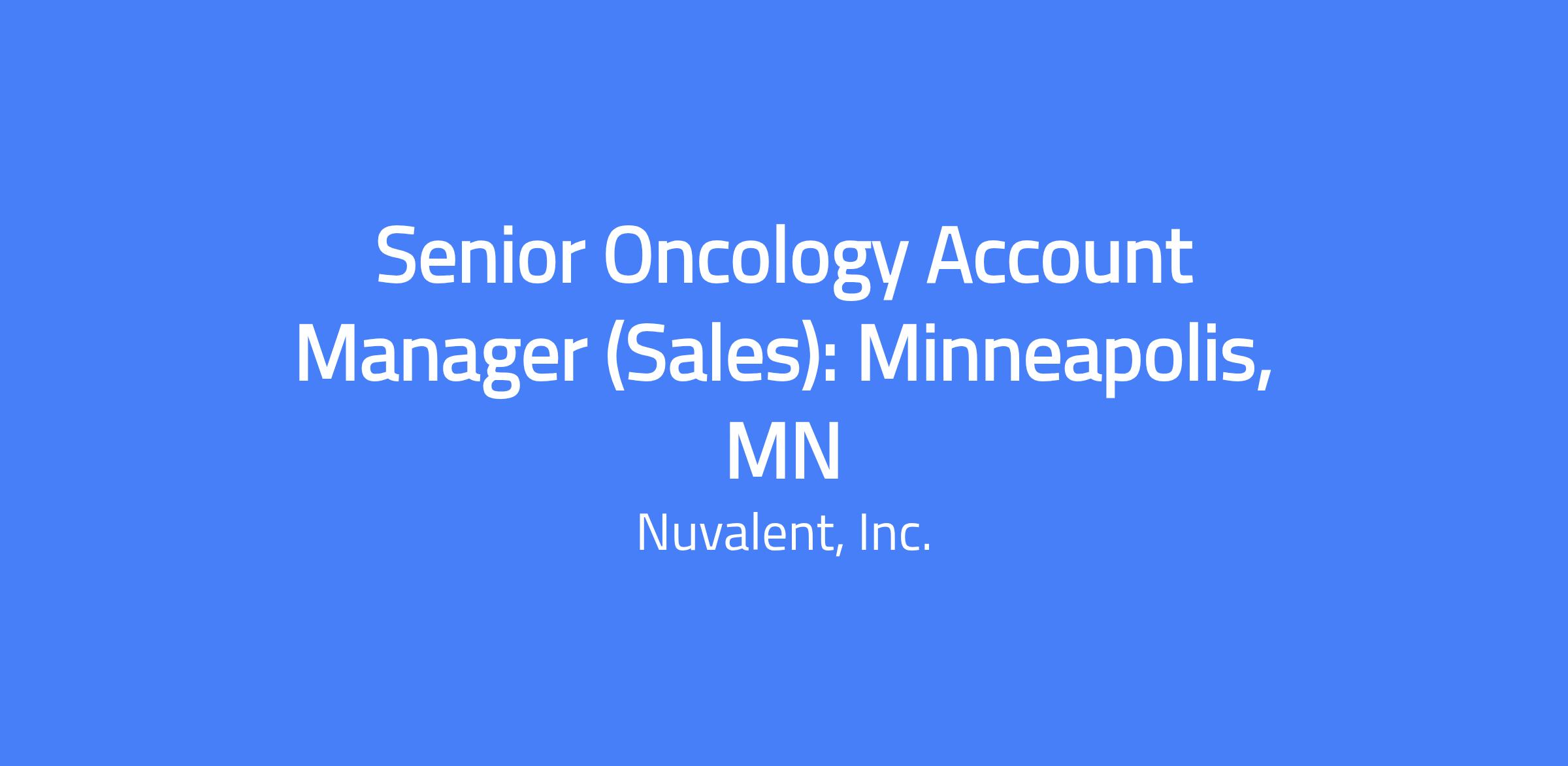 Senior Oncology Account Manager (Sales) for the Minneapolis, MN territory. This field-based role reports to the Senior Regional Business Director and focuses on meeting territory sales objectives by providing physicians, pharmacists, nurses, and other healthcare professionals with Nuvalent’s products, services, and approved information to support appropriate prescribing. The role implements Nuvalent’s marketing strategies and plans to achieve short-term and long-term objectives while maintaining compliance with drug laws and company policies.