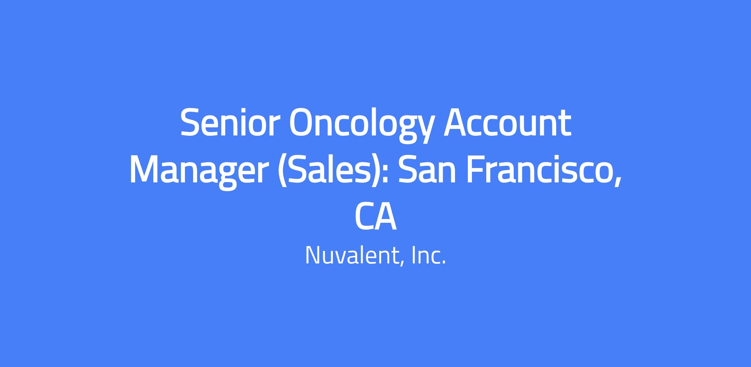 Field-based role covering the West territory (San Francisco Bay Area, San Jose, CA, and Hawaii). Located near San Francisco, CA. The Senior Oncology Account Manager (Sr. OAM) will contribute to Nuvalentโs sales objectives by providing physicians, pharmacists, nurses, and other healthcare professionals with Nuvalent products, services, and approved information to enable appropriate prescribing. They will implement marketing strategies and plans to achieve short- and long-term objectives, manage the territory and administrative requirements, and ensure full compliance with drug laws and Nuvalent policies.