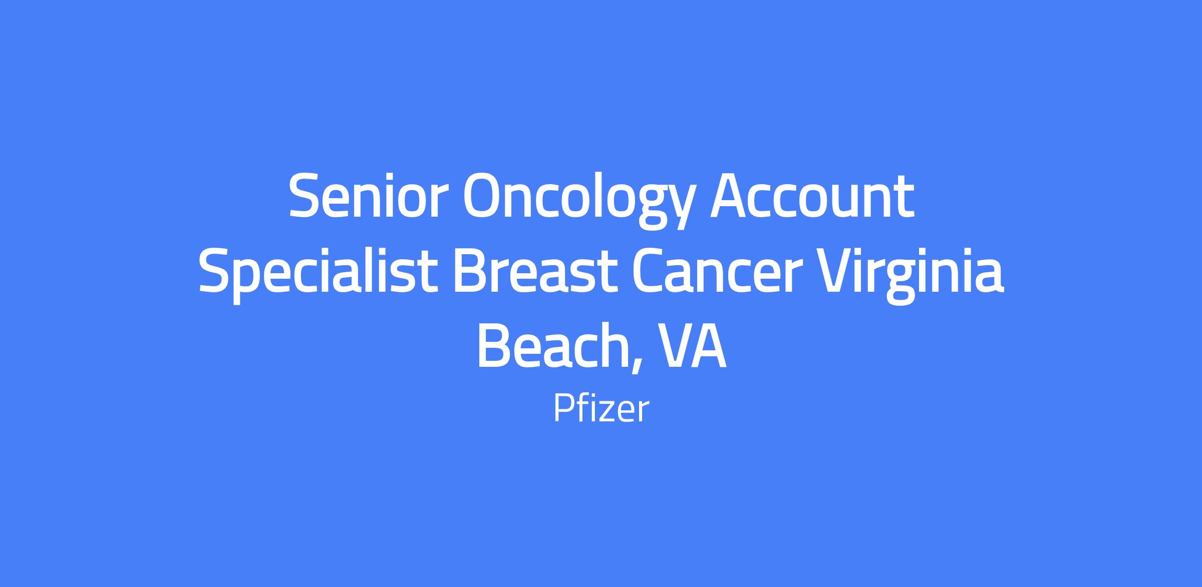 Senior Oncology Account Specialist – Breast Cancer, based in Virginia Beach, VA. Responsible for promoting Pfizer’s oncology portfolio to healthcare providers and specialists, educating the healthcare community on the appropriate use of Pfizer products, and engaging accounts to improve patient experience and overall quality of care. The SOAS uses account insights and Pfizer resources to strengthen Pfizer’s presence with high-value customers.