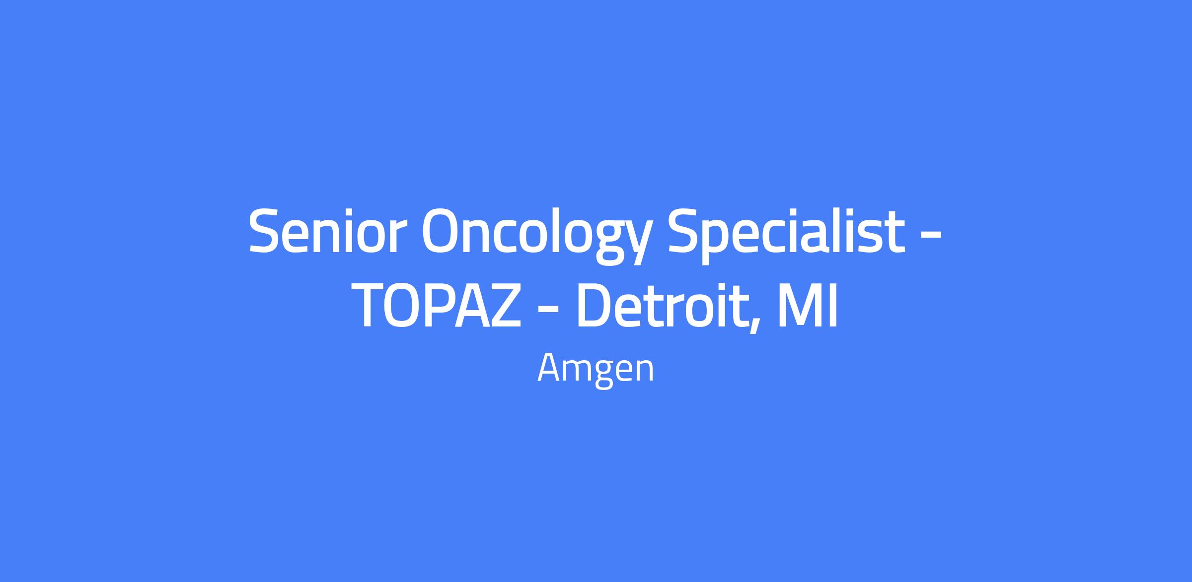 Senior Oncology Specialist in Detroit, MI (TOPAZ territory: Rochester, Flint, Cass City, Bad Axe). The primary role is to act as the liaison to medical professionals, providing current clinical knowledge of Amgen's oncology products and communicating their clinical and economic benefits. You will develop and execute a comprehensive territory plan to achieve sales targets and improve patient access to therapies.