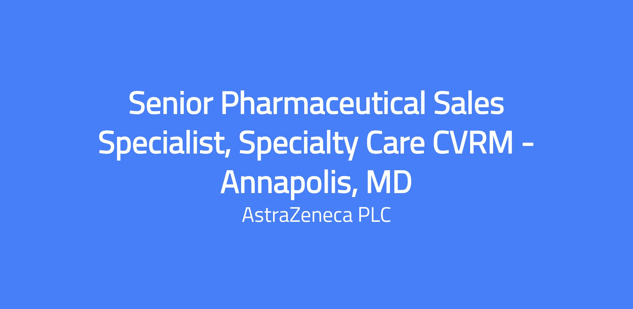 Senior Pharmaceutical Sales Specialist, Specialty Care CVRM â Annapolis, MD At AstraZeneca, we turn ideas into life-changing medicines. Working here means thinking big and working together to make the impossible a reality. Weâre focused on the potential of science to address the unmet needs of patients around the world. We commit to those areas where we think we can really change the course of medicine and bring big new ideas to life. At AstraZeneca, we are taking bold action on climate because we recognize the connection between healthy people and a healthy planet. As part of our flagship Ambition Zero Carbon program, we have committed to a fully electric vehicle (EV) fleet by the end of 2025, which means that all our drivers will be assigned an EV. AstraZeneca's strategy in CVRM is a patient-centric approach to disease treatment, so we are tackling multiple risk factors by uniting our cardiovascular (CV), metabolic and chronic kidney disease (CKD) areas into one integrated approach â cardiovascular renal metabolic (CVRM).⯠This approach means we look at the CVMD patient as a whole, rather than by disease area, because we know that cardiovascular disease is a well-known consequence of diabetes and CKD.⯠Each of ours focus areas seek to further reduce morbidity, mortality and organ damage by addressing multiple risk factors across cardiovascular (CV) disease, diabetes and chronic kidney-disease indications. The patient-centric approach is reinforced by science-led life-cycle management programs and technologies, including early research into regenerative methods. As a Senior Pharmaceutical Sales Specialist for the Specialty Care Team, youâll play a pivotal role in channeling our scientific capabilities to make a positive impact on changing patientsâ lives. Accountabilities: Develop and demonstrate strong knowledge of clinical disease states and treatment guidelines. Effectively communicate product information to healthcare professionals to influence prescribing behavior. Execute call plans and Brand Strategy by translating data to actionable insights. Build and maintain working relationships with healthcare professionals. Drive portfolio demand performance through meaningful customer interactions leveraging multiple channels, such as digital platforms and face-to-face engagements to reach the customers. Demonstrate openness to new ideas and seek innovative approaches to sales and customer engagement. Essential Skills/Experience: Bachelorâs Degree 2+ yrs of demonstrated Sales or Commercial experience or a combination of: pharmaceutical, healthcare, scientific, clinical, institutional or related industry experience A valid driverâs license and safe driving record Essential Skills and Capabilities: Customer Engagement: Demonstrated commitment to improving patient outcomes through effective engagement with healthcare professionals. Advanced Sales Techniques: Experience with advanced sales techniques and strategies tailored to specialty care markets. Clinical Acumen: Strong understanding of clinical trial data and the ability to communicate complex scientific information clearly. Business Acumen: Ability to conduct detailed market analysis and leverage insights for strategic planning. Desirable Skills/Experience: Therapeutic area experience, specialization in clinical setting, and sales experience At AstraZeneca, we are on a journey to bring life-saving medicines to patients. Our role in contributing to decreasing mortality rates globally is clear. We shape the future by spotting scientifically-led commercial opportunities and acting now to operationalize and scale them. Driven by the solutions we bring to the healthcare ecosystem, we make an impact at every step of the patient journey, improving their experience and outcomes. Our inclusive team draws on diverse backgrounds, skills, and experiences to create innovative solutions that make a difference. Join us in making a meaningful impact on patients' lives by applying today! The annual base salary for this position ranges from $109,415.20 -$202,510.80. However, base pay offered may vary depending on multiple individualized factors, including market location, job-related knowledge, skills, and experience. In addition, our positions offer a short-term incentive bonus opportunity; eligibility to participate in our equity-based long-term incentive program (salaried roles) or to receive a retirement contribution (hourly roles). Benefits offered included a qualified retirement program [401(k) plan]; paid vacation and holidays; paid leaves; and, health benefits including medical, prescription drug, dental, and vision coverage in accordance with the terms and conditions of the applicable plans. Additional details of participation in these benefit plans will be provided if an employee receives an offer of employment. If hired, employee will be in an âat-will positionâ and the Company reserves the right to modify base salary (as well as any other discretionary payment or compensation program) at any time, including for reasons related to individual performance, Company or individual department/team performance, and market factors. Date Posted 06-Apr-2026 Closing Date 30-May-2026 Our mission is to build an inclusive environment where equal employment opportunities are available to all applicants and employees. In furtherance of that mission, we welcome and consider applications from all qualified candidates, regardless of their protected characteristics. If you have a disability or special need that requires accommodation, please complete the corresponding section in the application form. AstraZeneca is a global, science-led, patient-focused biopharmaceutical company. We focus on discovering, developing and commercialising prescription medicines for some of the worldâs most serious diseases. But we are more than one of the worldâs leading pharmaceutical companies. At AstraZeneca, weâre dedicated to being a Great Place to Work. Where you 
