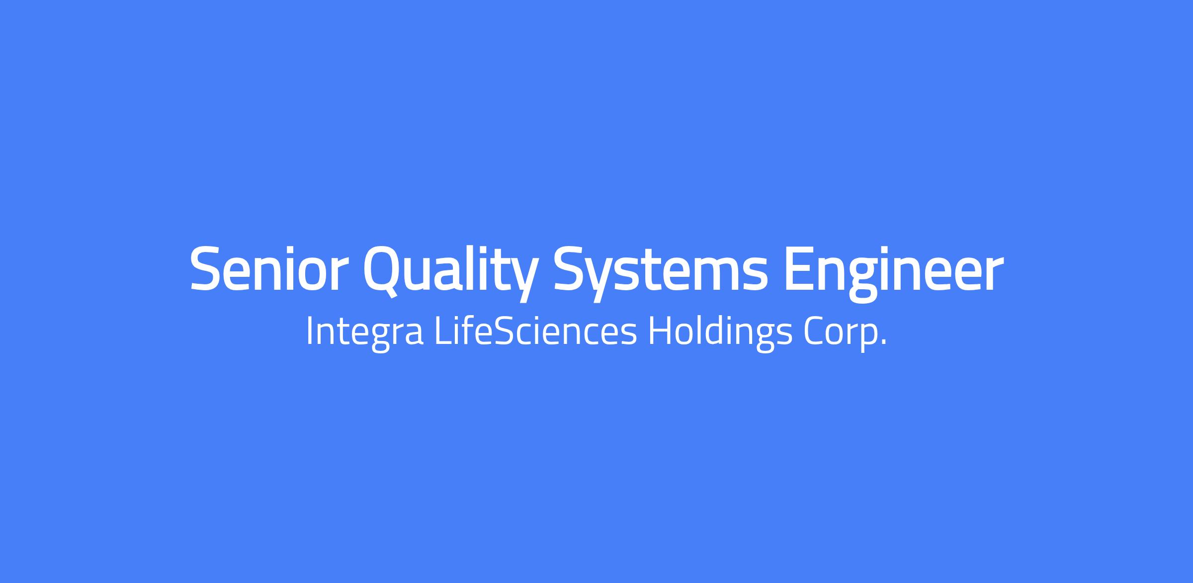 Changing lives. Building Careers. Joining us is a chance to do important work that creates change and shapes the future of healthcare. Thinking differently is what we do best. To us, change equals opportunity. Every day, our colleagues are challenging whatâs possible and making headway to innovate new treatment pathways to advance patient outcomes and set new standards of care. The Sr. Quality Systems Engineer is responsible for supporting the site Quality Management System (QMS). Primary responsibilities include driving improvements to the QMS, having oversight of and ensuring compliance to the CAPA, NC and Quality Planning (QP) processes, and providing experienced quality assurance support to manufacturing and product development teams as well as lower-level Quality Engineers. Responsibilities Supports maintenance of the Quality management System, ensuring compliance to regulations and internal site and global procedures. Identifies gaps in the QMS and drives improvements to close gaps. Maintains the Quality Manual and site Quality System related procedures, ensuring contents are compliant and appropriate for the business. Analyzes current and future procedural needs of the business. Supports external Quality System audits in key roles. Provides support and subject matter expertise during audits and inspections. Assists in the initiation, processing and completion of NC records in the electronic system. Leads meetings and communications for NC updates, information and concerns to keep NC timelines on track. Responsible for collecting and reporting Quality Metrics on regular basis in accordance with established procedures. Independently investigates, gathers data, and performs preliminary data analyses. Reports on Key Performance Indicators to adhere to process and prevent occurrence of any non-conformity relating to product, process, or system. Provides experienced quality assurance support to manufacturing, product development teams, procurement, and other functional areas. Mentors lower-level Quality Engineers. Provides training of quality awareness and quality processes, as necessary. Keeps up with current and developing Quality Management System trends and changes and collaboratively implements those changes into the QMS. Undertakes special projects as required and contributes to continuous improvement activities. Supports and lead process improvement activities. Writes reports and presents progress at project meetings. Achieves goals within established budgets. Plans projects or subtasks so they may be tracked and presented. Attends various meetings and actions/communicates instructions and follow-ups. Independently determines approach for completion of assigned tasks. Coordinates and leads Quality Review meetings. Communicates confidently and effectively with all levels of management, peers and key stakeholders, including timely escalation of quality issues. Desire minimum Qualifications: Bachelors in a scientific discipline required with minimum of 5 years' experience preferably in the medical device industry; strong analytical skills, exceptional writing and interpersonal relationship skills or combination of relevant work experience and education. Previous NC and/or quality systems/assurance/engineering experience and demonstrated use of quality tools/methodologies. Detailed knowledge of FDA Quality Systems Regulations, ISO 13485 and other global regulations and standards. Previous experience in high volume manufacturing environment. Strong verbal and written communication skills with the ability to communicate effectively at multiple levels of the organization. Demonstrated organizational skills with the ability to multitask, prioritize and meet deadlines. Must be able to read and write in English. Salary Pay Range: $81,650.00 - $112,700.00 USD Salary Our salary ranges are determined by role, level, and location. Individual pay is determined by several factors including job-related skills, experience, and relevant education or training. In addition to base pay, employees may be eligible for bonus, commission, equity or other variable compensation. Your recruiter can share more about the specific salary range for your preferred location during the hiring process. Additional Description for Pay Transparency: Subject to the terms of their respective plans, employees and/or eligible dependents are eligible to participate in the following Company sponsored employee benefit programs: medical, dental, vision, life insurance, short- and long-term disability, business accident insurance, and group legal insurance, and savings plan (401(k)). Subject to the terms of their respective policies and date of hire, Employees are eligible for the following https://jobs.integralife.com/total-rewards/ Integra LifeSciences is an equal opportunity employer, and is committed to providing equal employment opportunities to all qualified applicants and employees regardless of race, marital status, color, religion, sex, age, national origin, sexual orientation, physical or mental disability, or protected veteran status. This site is governed solely by applicable U.S. laws and governmental regulations. If you'd like more information on your rights under the law, please see the following notices: EEO Is the Law | EOE including Disability/Protected Veterans Integra LifeSciences is committed to provide qualified applicants and employees who are disabled veterans or individuals with disabilities with needed reasonable accommodations in accordance with the ADA. If you have difficulty using our online system due to a disability and need an accommodation, please email us at careers@integralife.com. Unsolicited Agency Submission Integra LifeSciences does not accept unsolicited assistance from search firms for employment opportunities. All CVs/resumes submitted by search firms to any employee at our company without a valid written search agreement in place for this position will be deemed the sole property of o