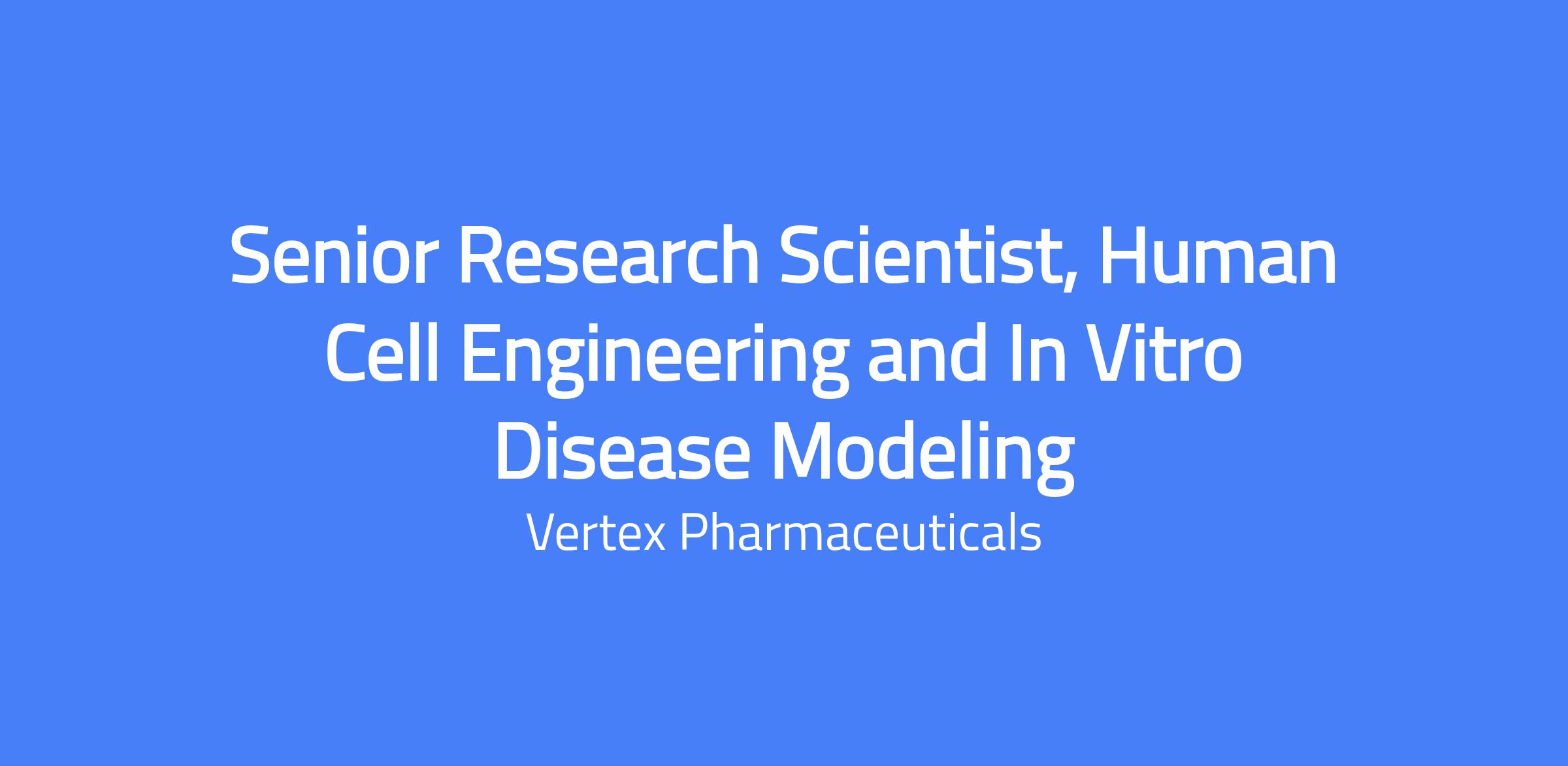 Senior Research Scientist to join the Disease Modeling Group. Develop engineered human cell models and integrate them into drug discovery workflows to support translational relevance and advance Vertexβs pipeline. Apply expertise in human cell biology, primary cell systems, iPSC technologies, and gene editing to develop robust in vitro disease models that support target validation, proof-of-concept studies, primary screening, selectivity and efficacy assessments, mechanism of action studies, and medicinal chemistry optimization. This is a full-time, onsite position in San Diego.