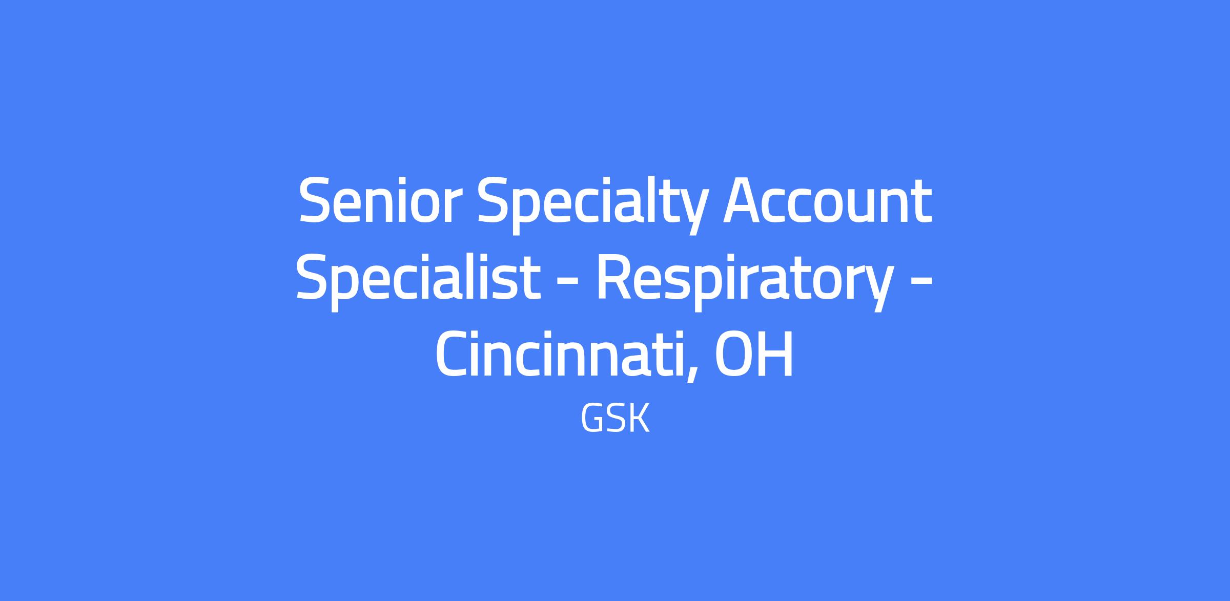 Senior Specialty Account Specialist - Respiratory in Cincinnati, OH. Provides scientific knowledge, business acumen, and customer engagement to specialist customers in support of a GSK biologic product; develops and implements strategies to generate sales; builds and maintains relationships with Marketing, Payer Relations, Medical, and other internal teams; ensures compliant, high-quality customer service.