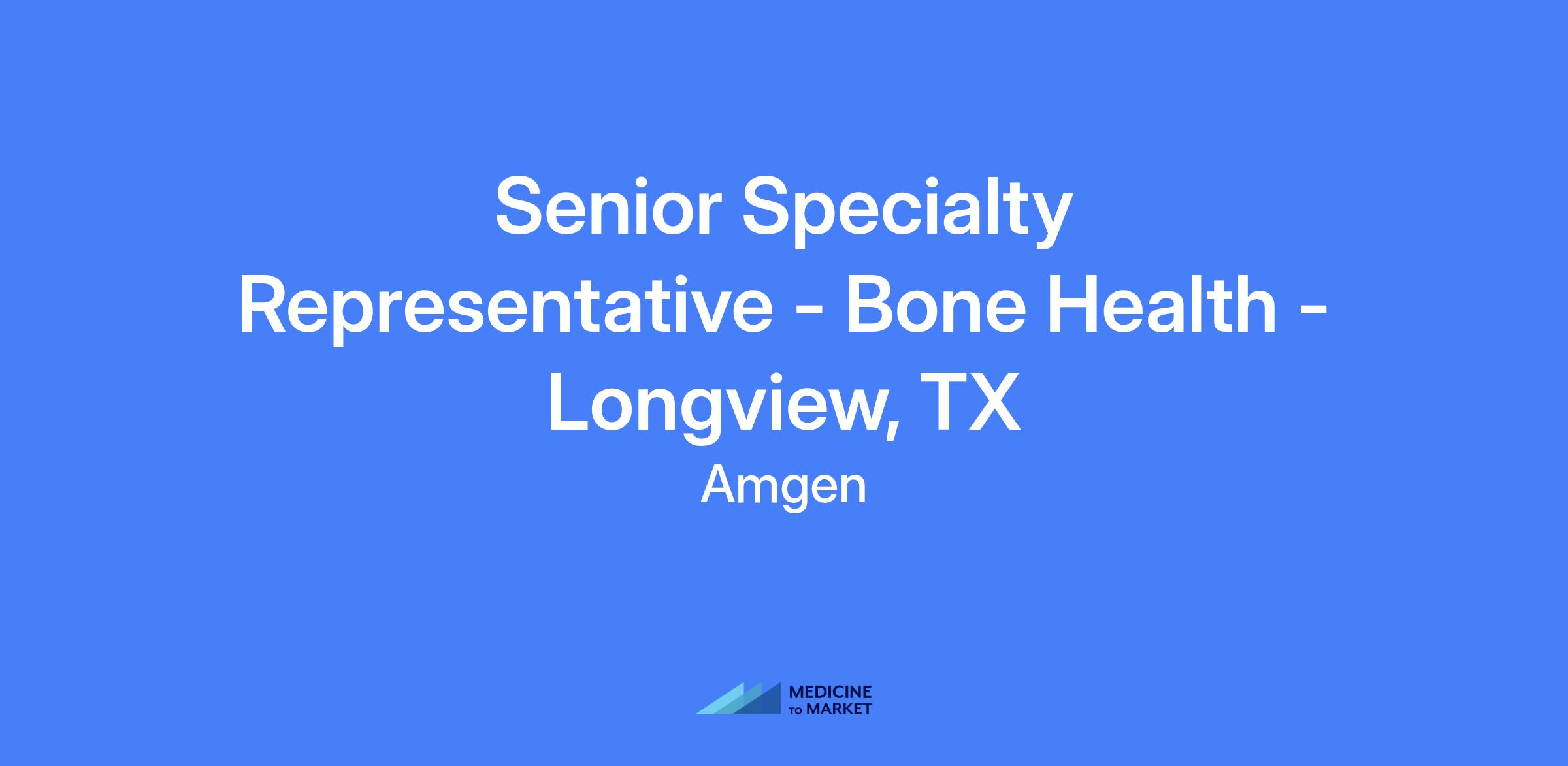 Senior Specialty Representative – Bone Health. Territory includes Longview, Tyler, Texarkana, Lufkin, TX. Relocation not offered. Responsible for delivering clinical knowledge of Amgen products to medical professionals, promoting products, and implementing marketing strategy under the District Manager.
