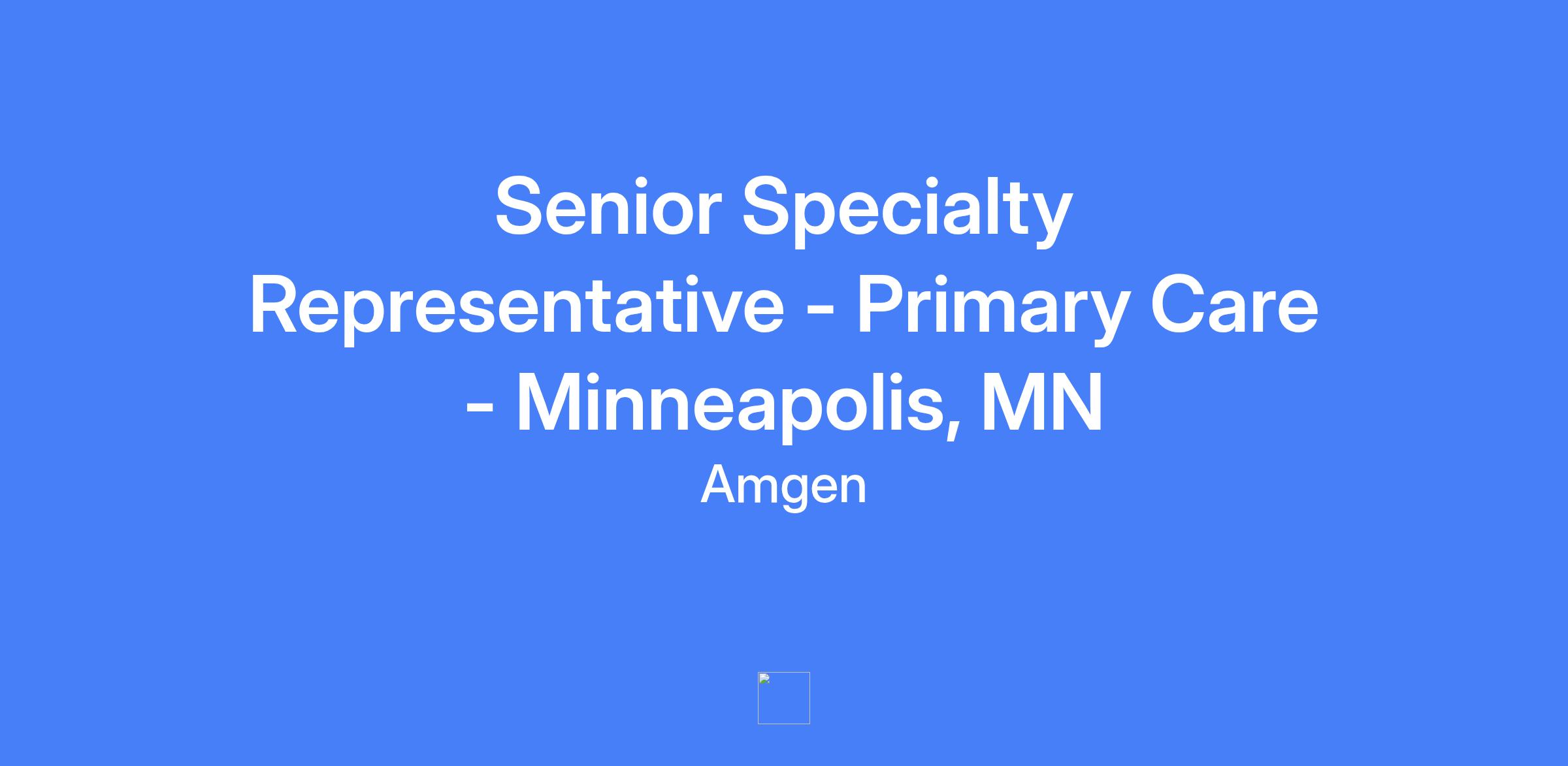 Senior Specialty Representative - Primary Care in Minneapolis, MN. Responsible for providing clinical knowledge of Amgen products to medical professionals, promoting products, and navigating the payer environment. Acts as the primary customer contact and implements marketing strategy under the District Manager’s guidance.